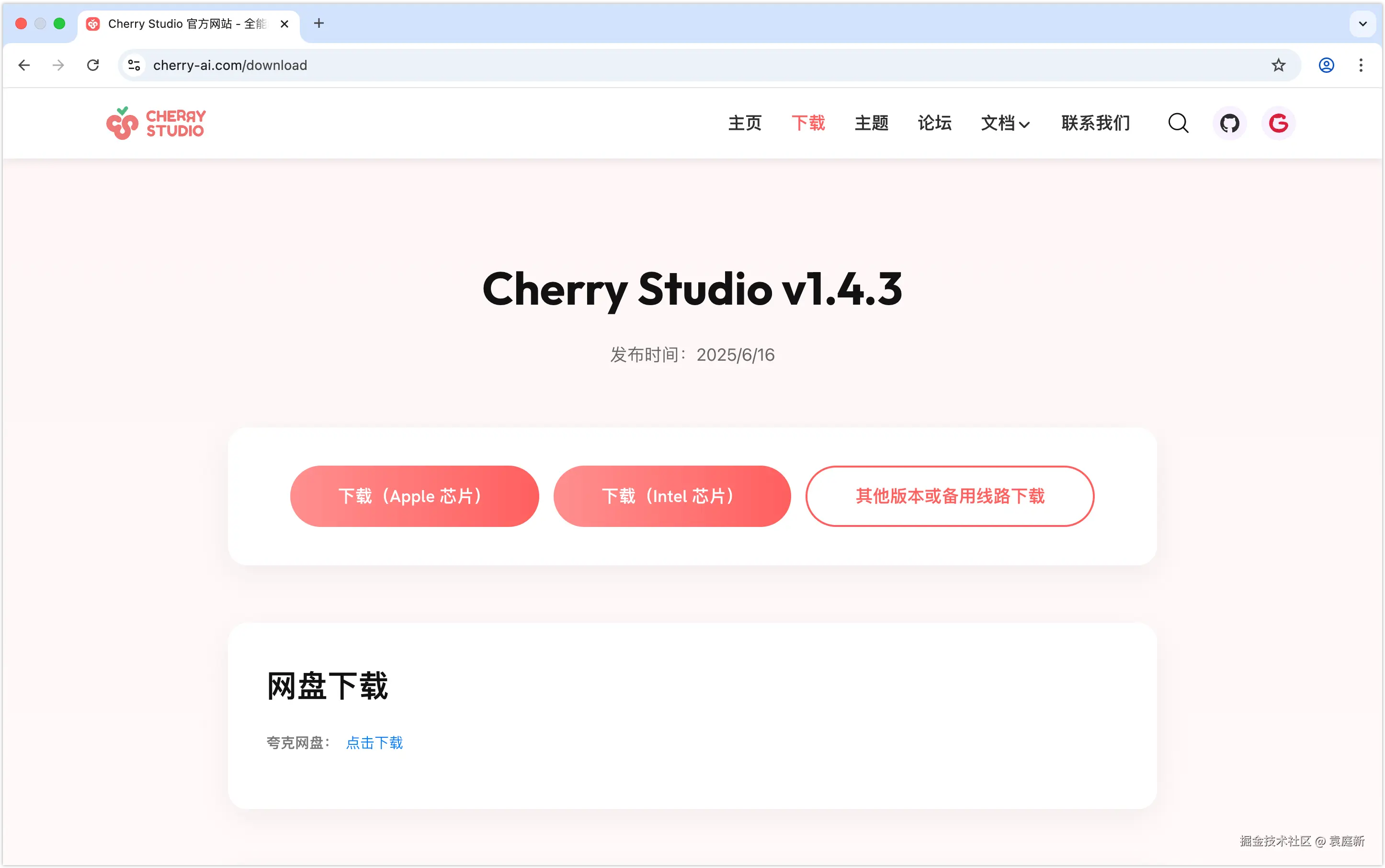 打开Cherry Studio官网(cherry-ai.com),在Cherry Studio的主页点击右上角的「下载」选项,将会打开如下图所示的下载界面。