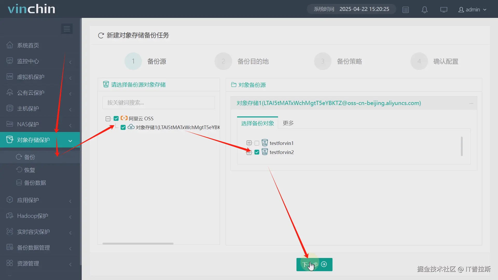 依次点击对象存储保护、备份,勾选本次演示的备份对象阿里云OSS对象存储,桶、目录文件都可单独勾选、多选或全选,本次演示以勾选其中一个桶为例,如图10。
