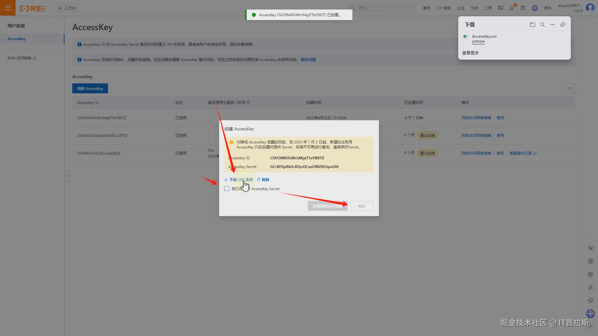 验证完成后点击下载CSV文件并确认,点击确定,AccessKey创建完成,如图6。