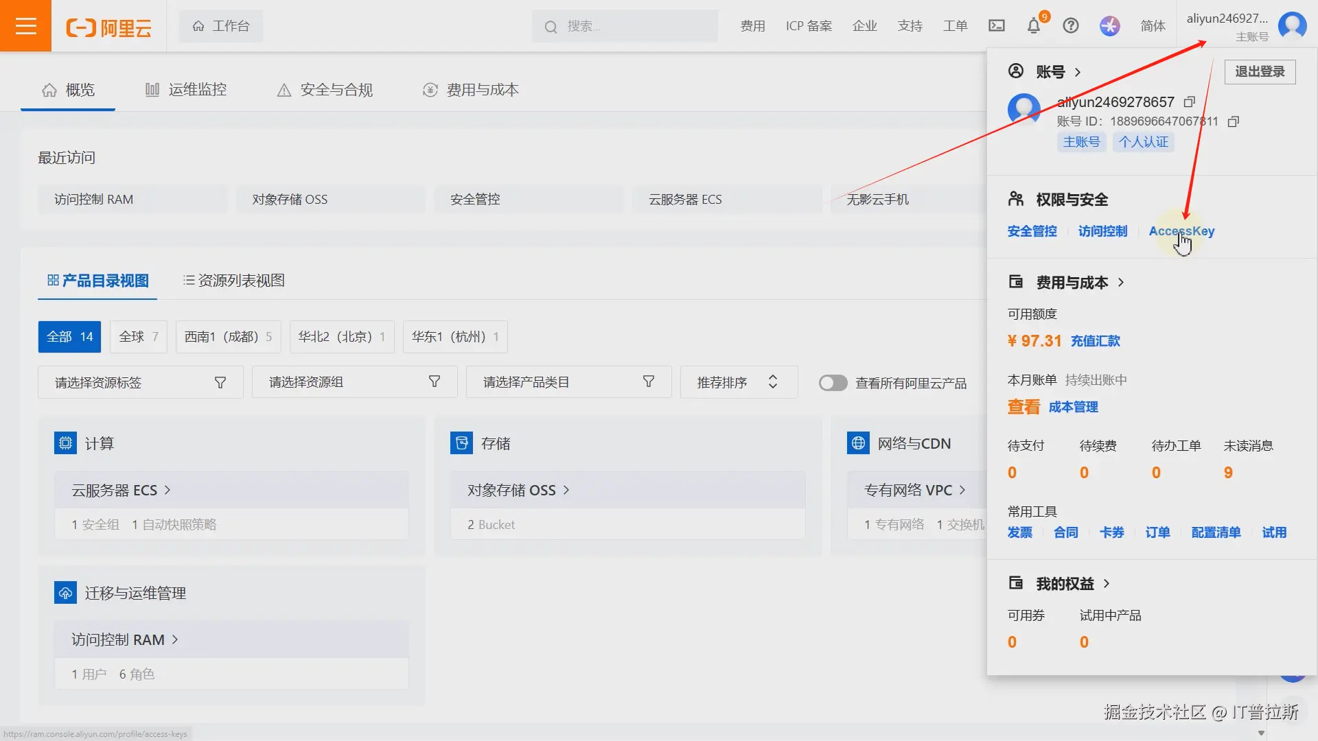 访问阿里云控制台,鼠标移至右上角账户处,在弹出菜单中点击AccessKey,如图1。