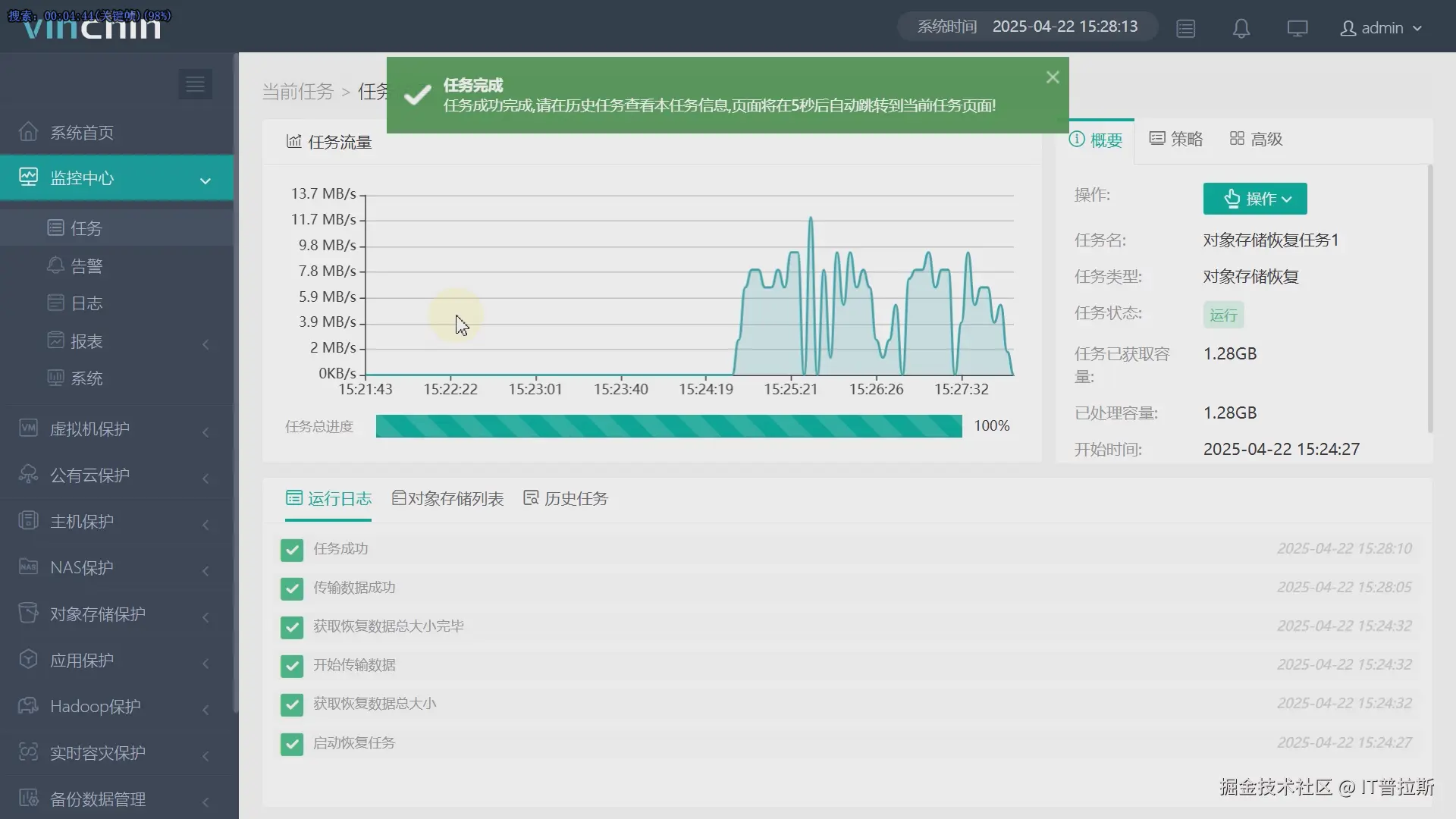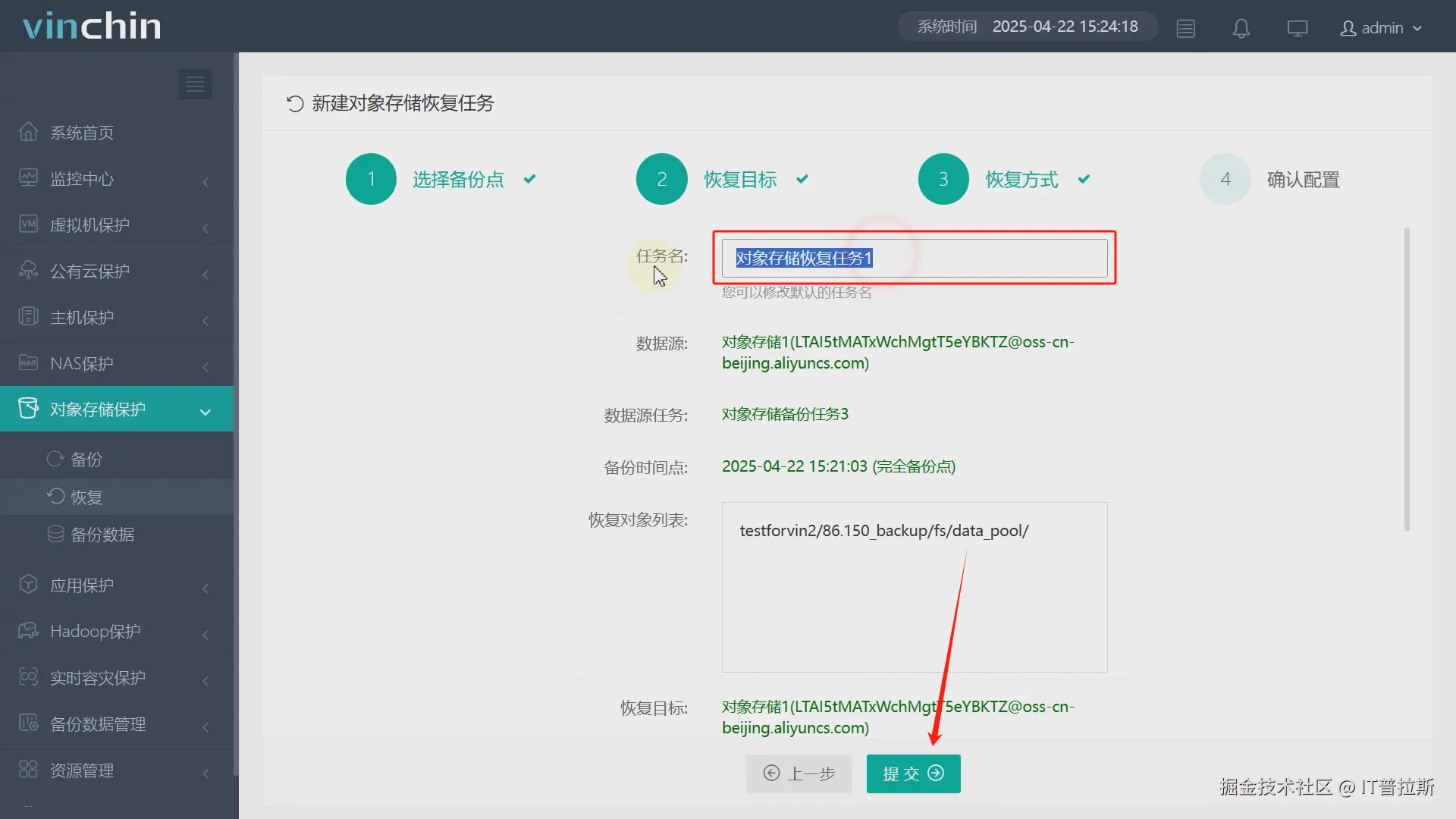 配置恢复任务名称、检查参数,无问题后点击提交,恢复任务创建完成,恢复任务将立即执行,如图18。