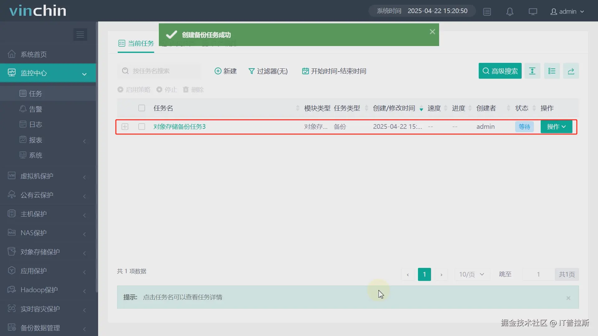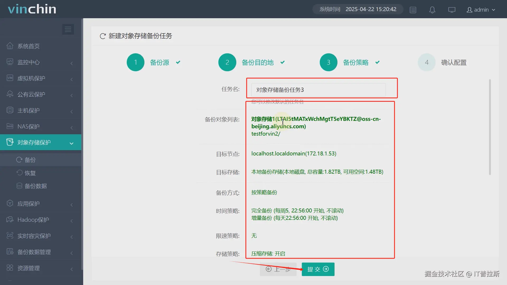 确认任务名称、任务参数,准确无误后点击提交,备份任务便创建完成,后续任务将按照配置的备份策略定期执行,如图13至图14。