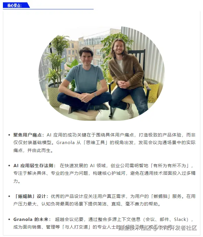 近期,Granola 的两位联合创始人 Chris Pedregal 和 Sam Stephenson 作为嘉宾参与了播客光速创投(Lightspeed Venture Partners)的录制。在访谈中,他们分享了他们从线上论坛相识到共同创业的经历,并阐述了 Granola 成功的核心秘诀:为高压工作状态下的用户设计极致简洁的「蜥蜴脑」产品。