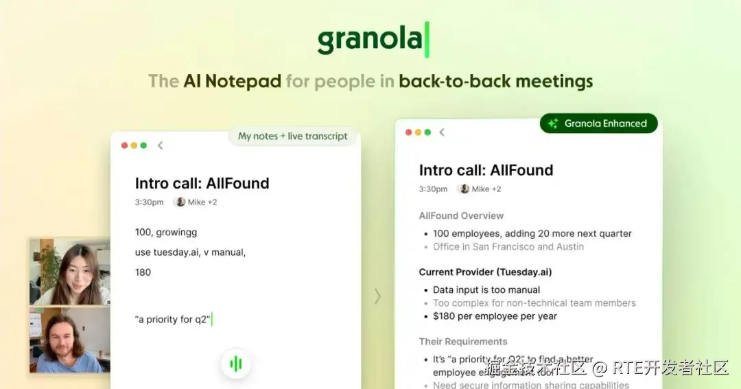 Granola 是一款利用 AI 整理和总结会议纪要的工具,凭借其新颖的交互方式在短时间内迅速成为科技、销售、招聘等多个领域专业人士的必备应用。今年 5 月,Granola 宣布完成 4300 万美元的 B 轮融资,估值达 2.5 亿美元。