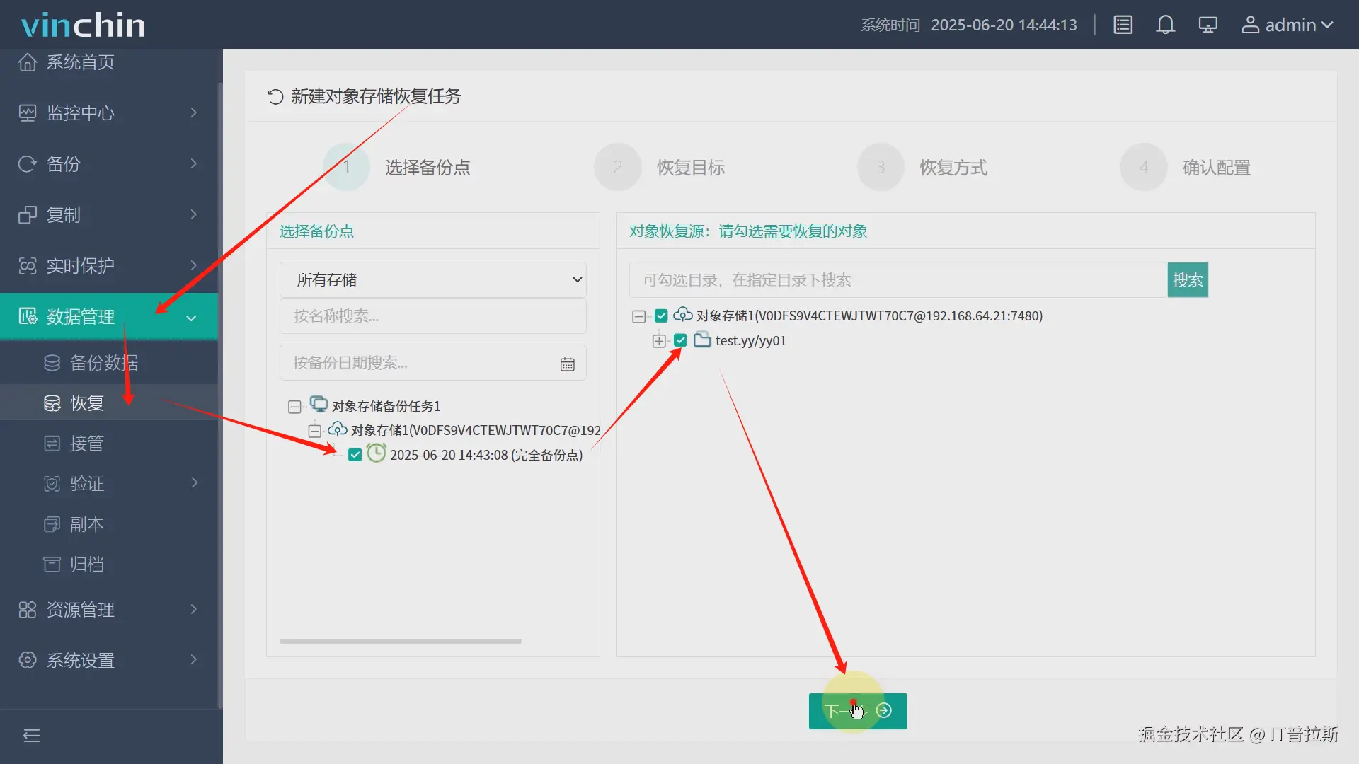依次点击数据管理、恢复,选择对应备份任务产生的备份数据,可选择Ceph S3整个对象存储、桶、目录或文件,本次演示以勾选全部备份数据为例,如图10。