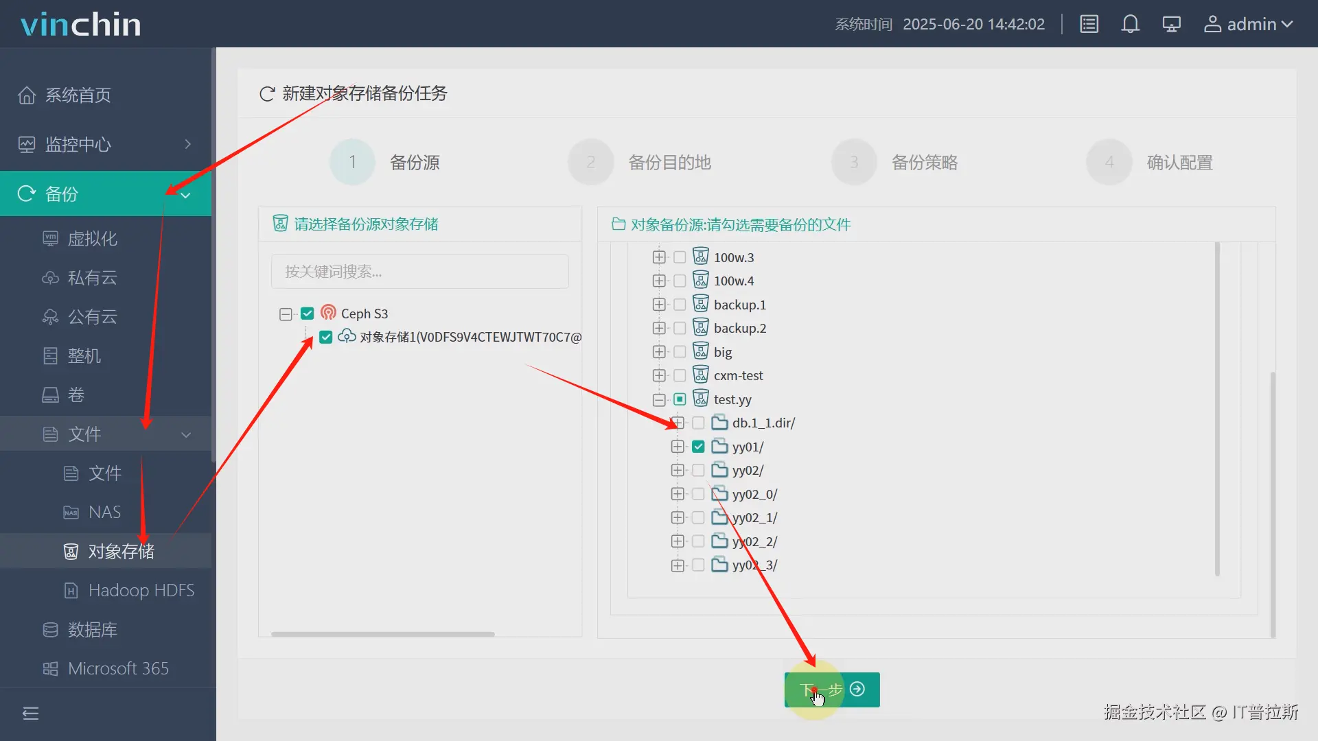 依次点击备份、文件、对象存储,勾选本次演示的备份对象Ceph S3对象存储,桶、目录文件都可单独勾选、多选或全选,本次演示以勾选其中一个目录为例,如图5。