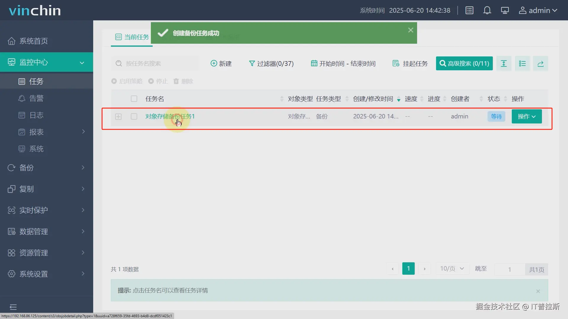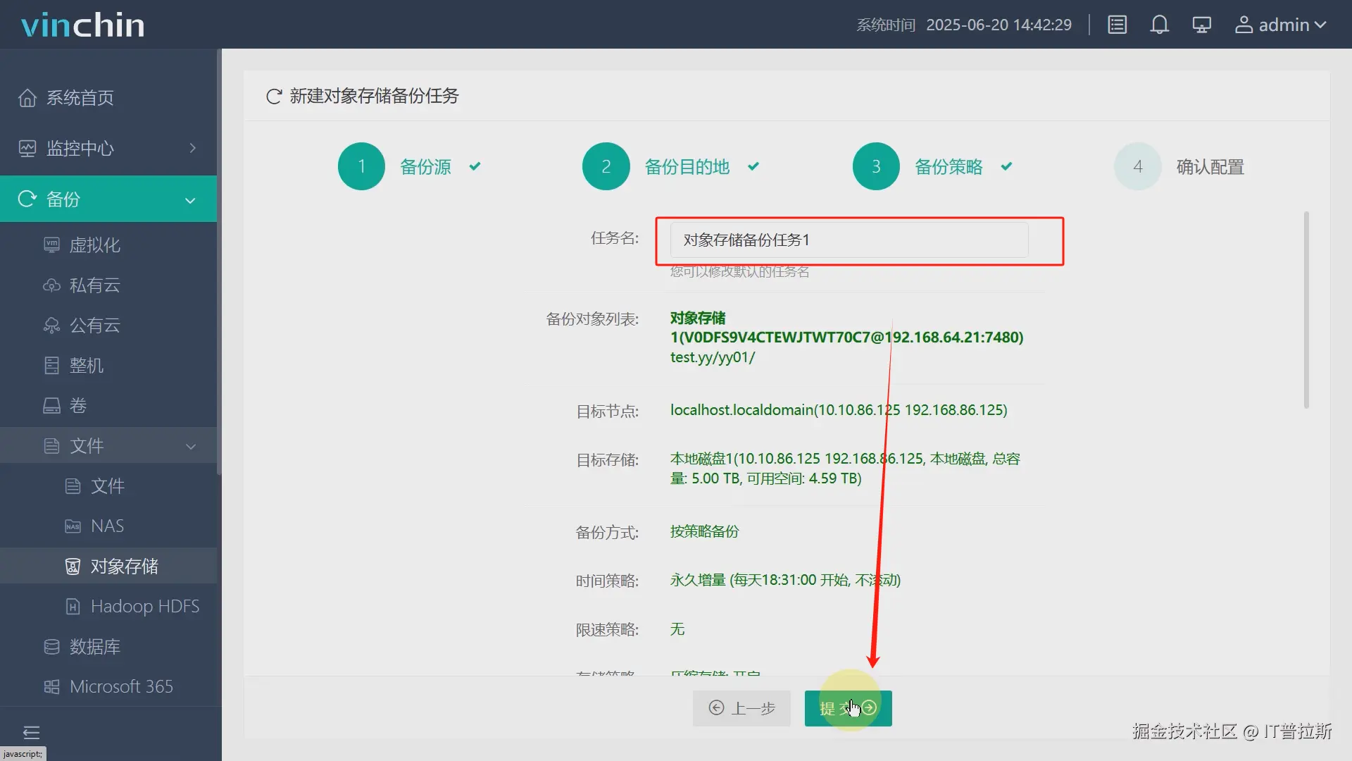 确认任务名称、任务参数,准确无误后点击提交,备份任务便创建完成,后续任务将按照配置的备份策略定期执行,如图8、图9。