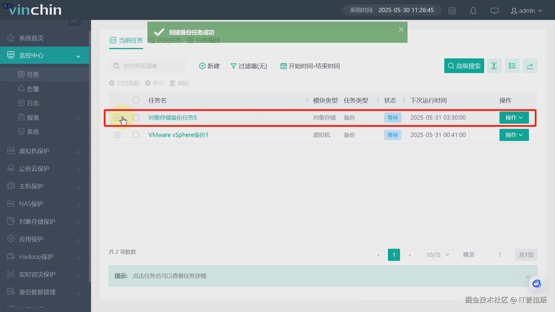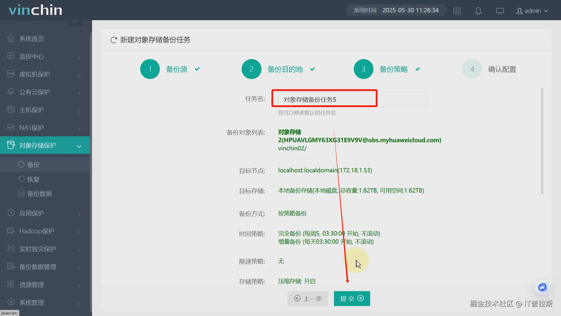 确认任务名称、任务参数,准确无误后点击提交,备份任务便创建完成,后续任务将按照配置的备份策略定期执行,如图11至图12。
