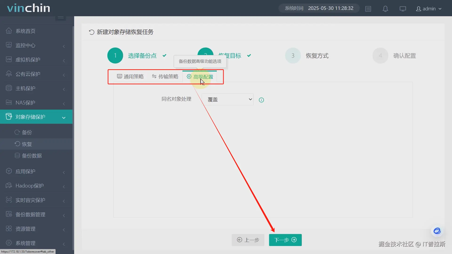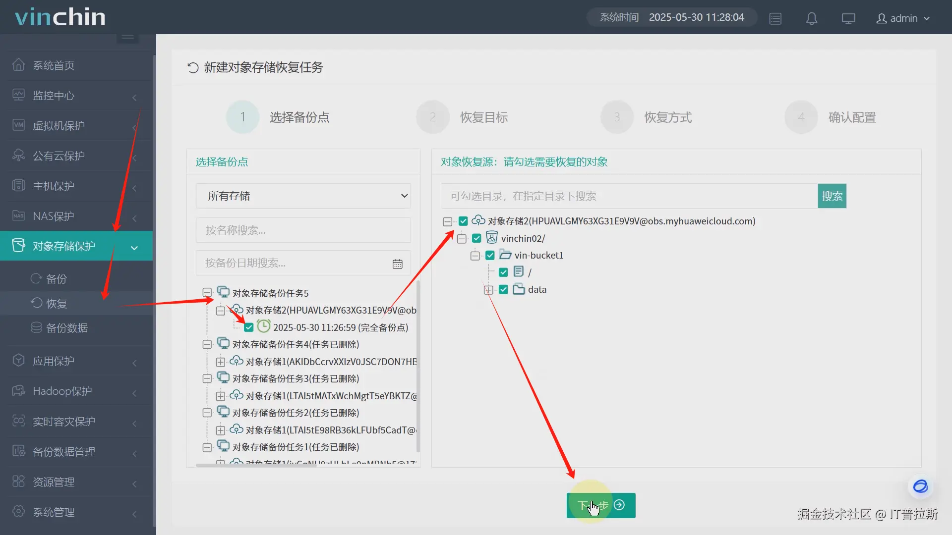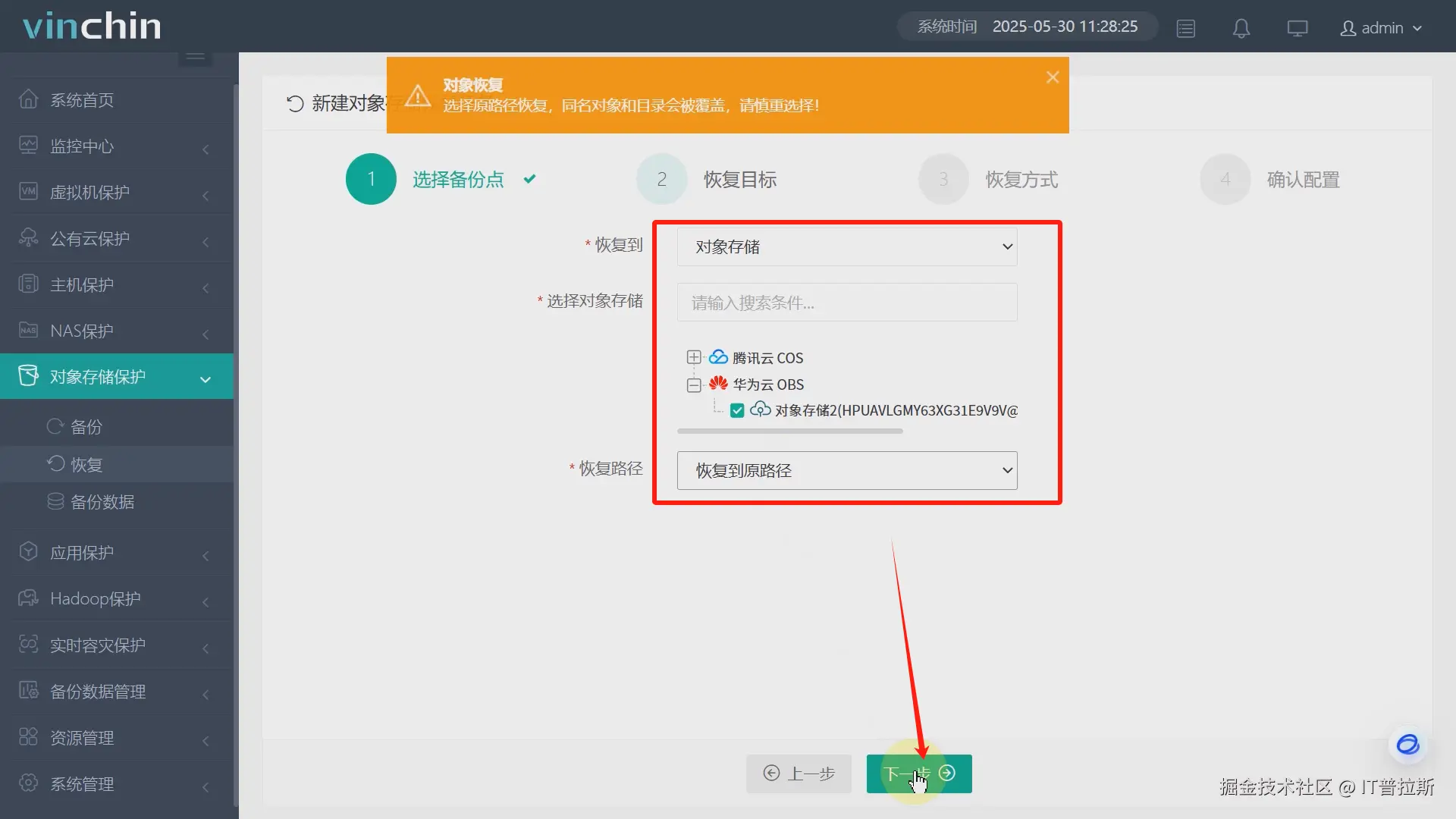 配置恢复到对象存储,选择对接的华为云对象存储,选择恢复到原路径,如图14。