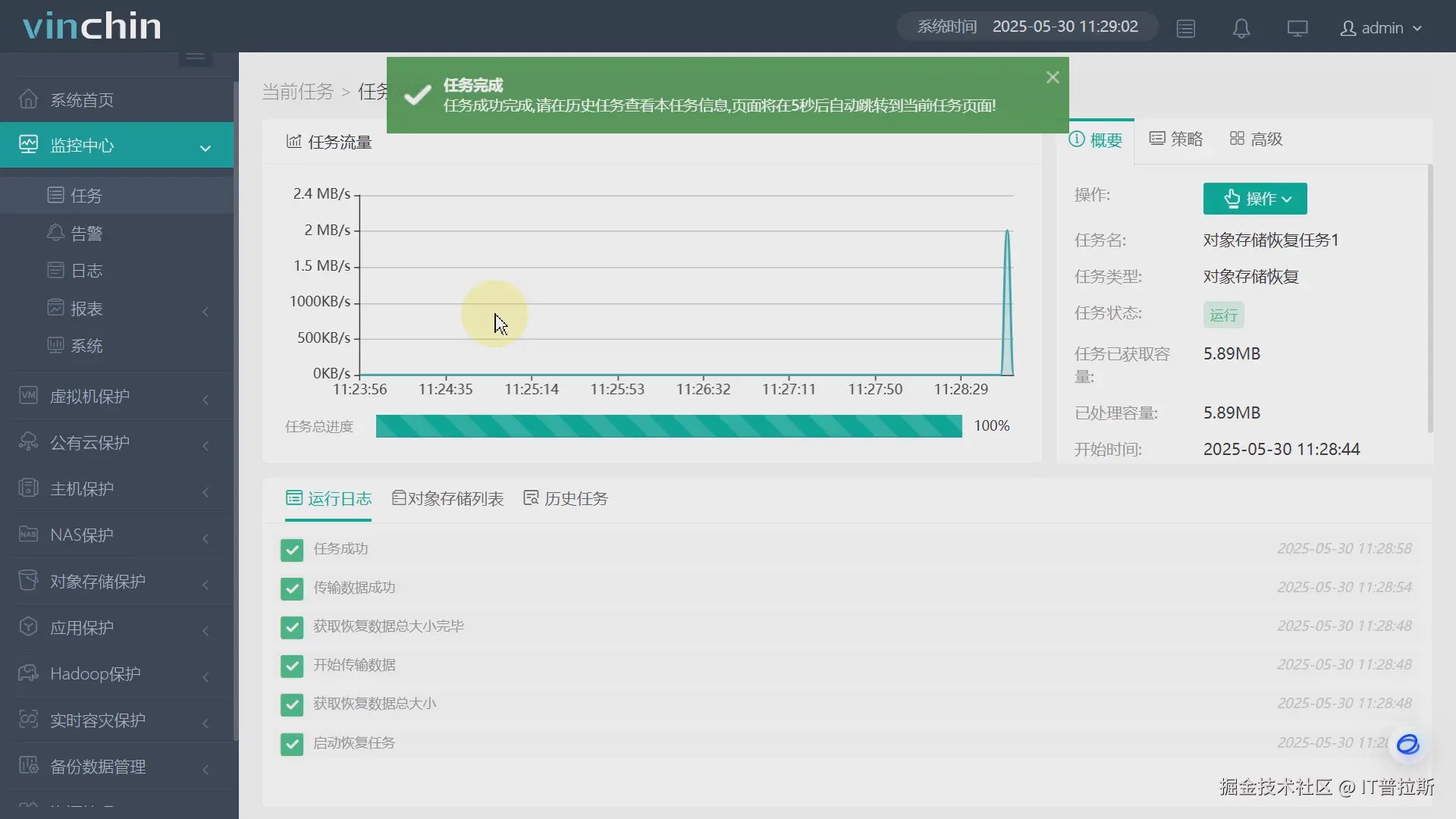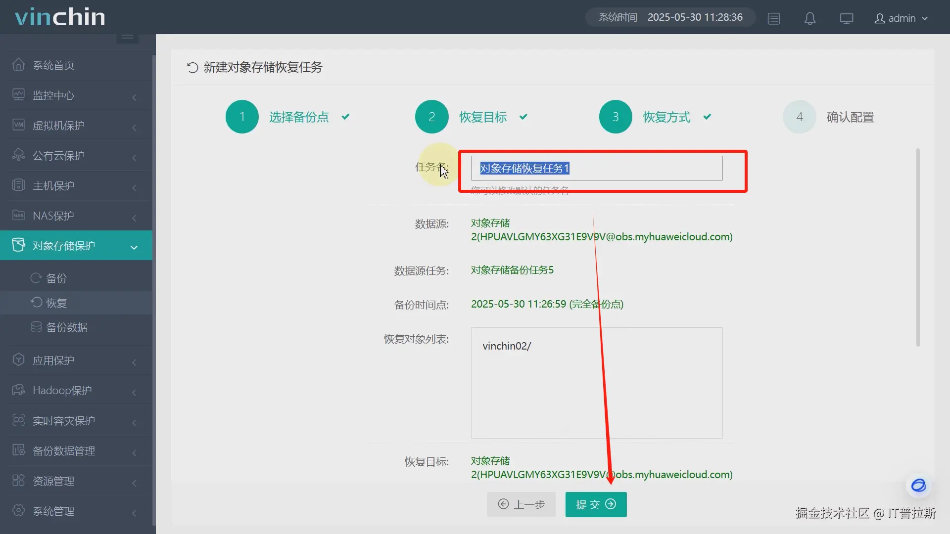 配置恢复任务名称、检查参数,无问题后点击提交,恢复任务创建完成,恢复任务将立即执行,如图16。