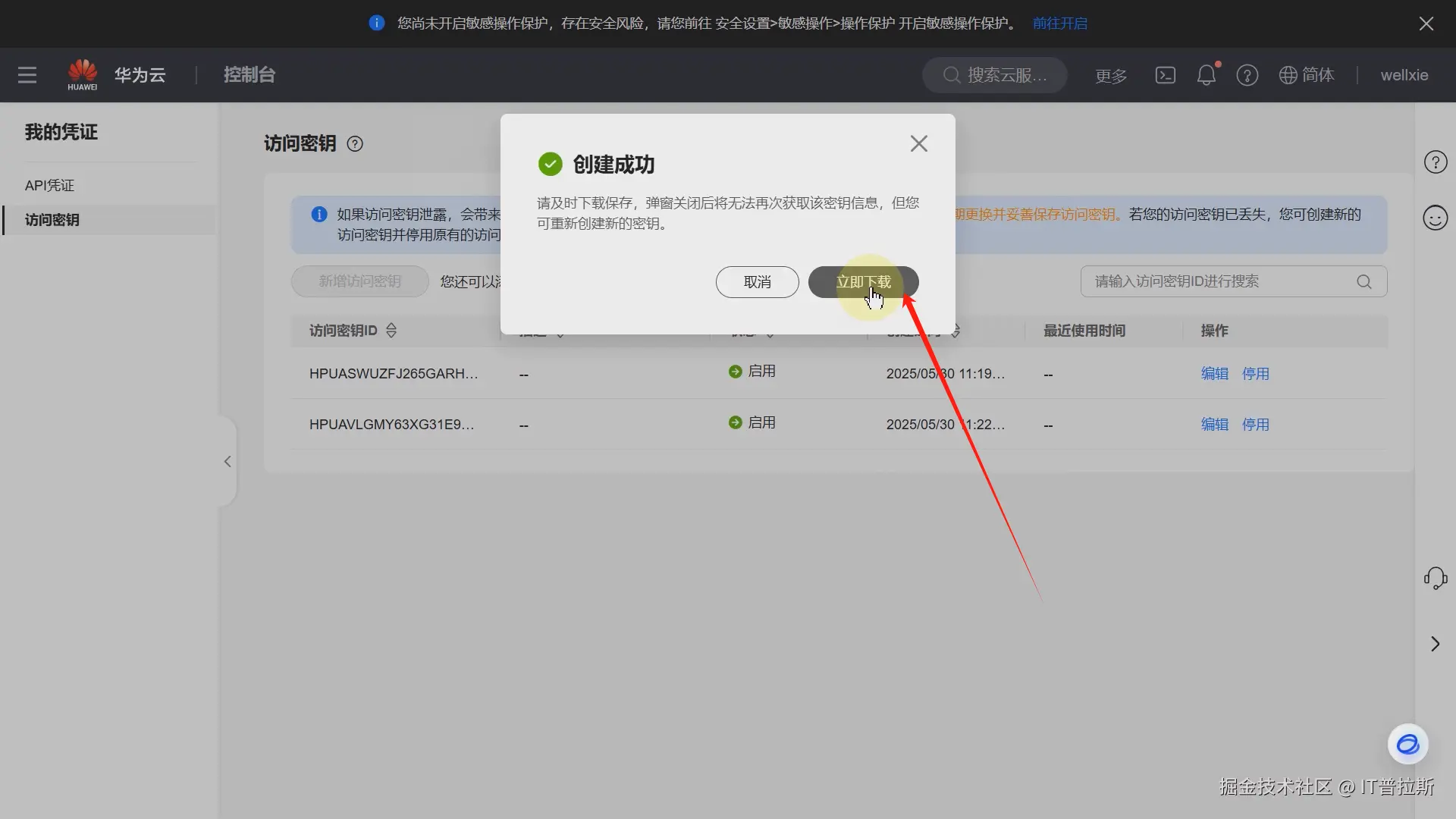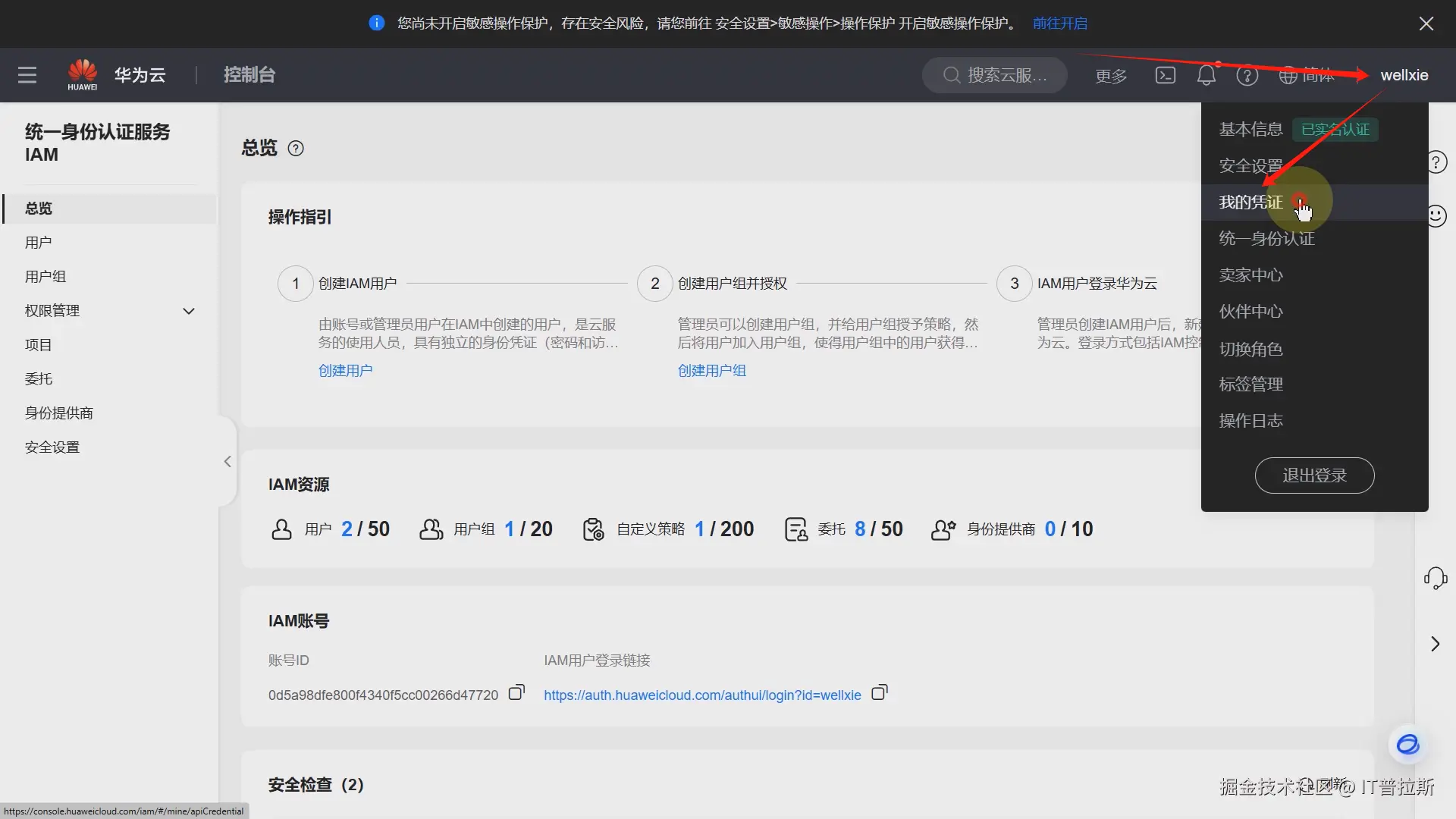 访问华为云控制台,鼠标移至右上角账户处,在弹出菜单中点击我的凭证,如图1。