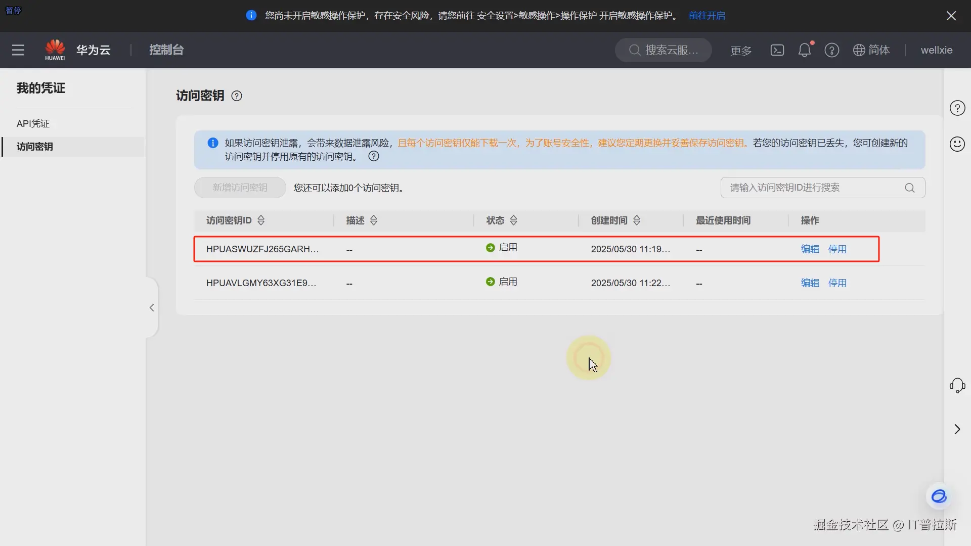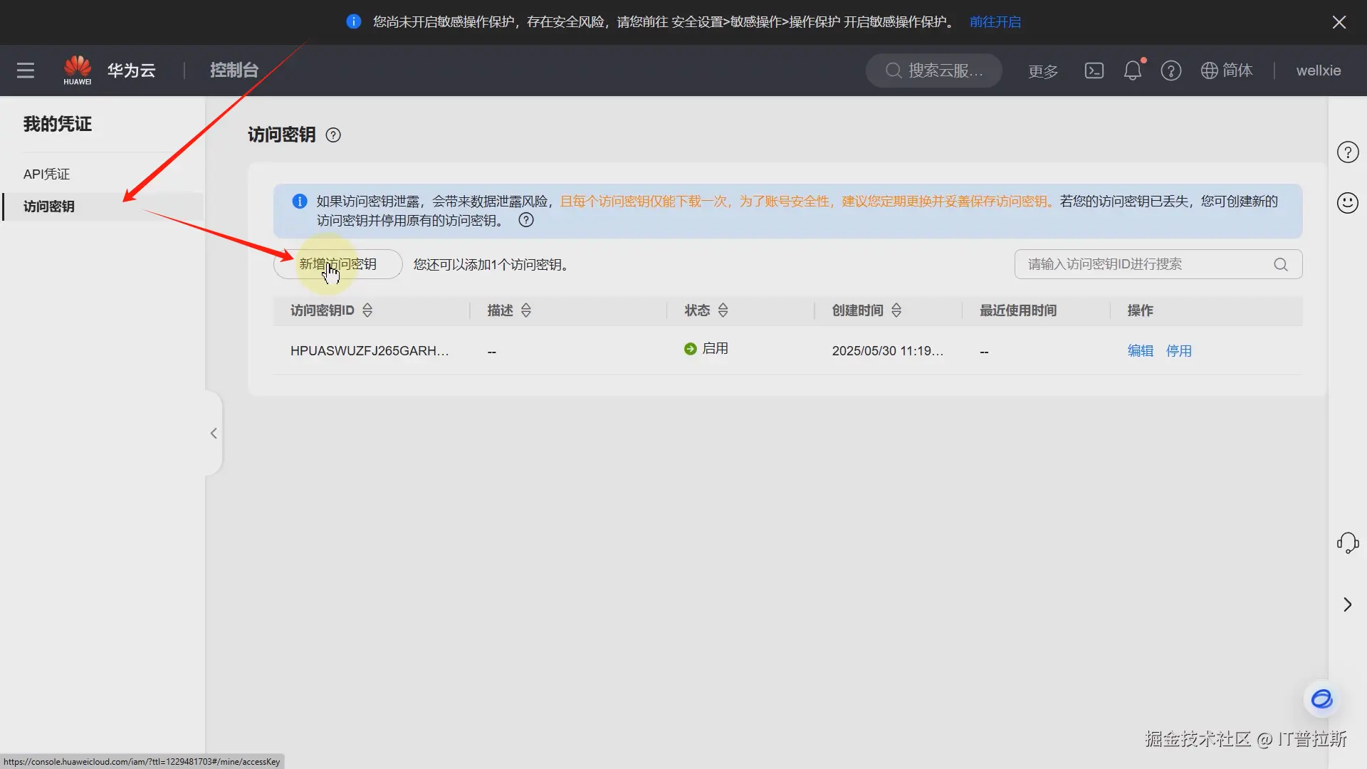 在左侧菜单栏点击访问密钥,再点击新增访问密钥。