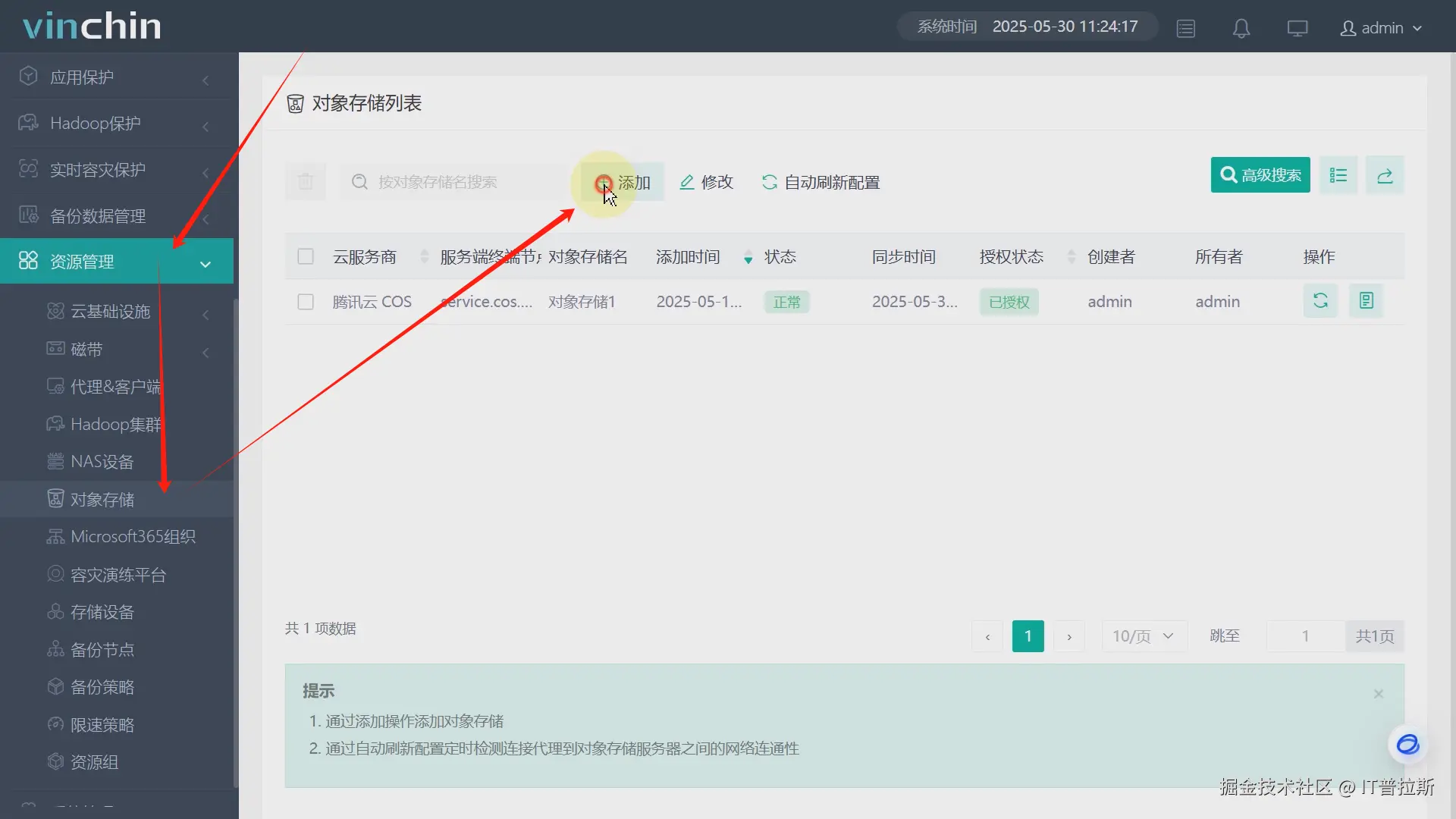 访问云祺容灾备份系统,依次点击资源管理、对象存储、添加,如图5。
