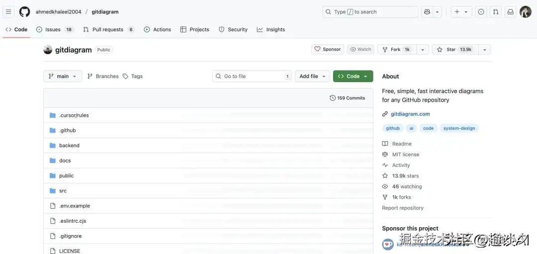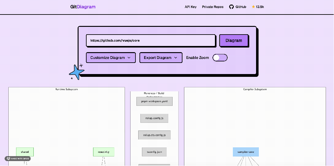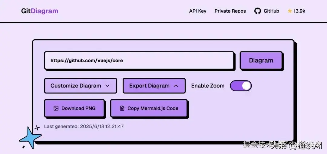 GitDiagram 是一个将 GitHub 仓库转换为交互式图表的工具,能帮助用户快速可视化仓库的系统设计和架构。目前已有接近14k的 star, 说明在技术圈的关注度还是挺高的。