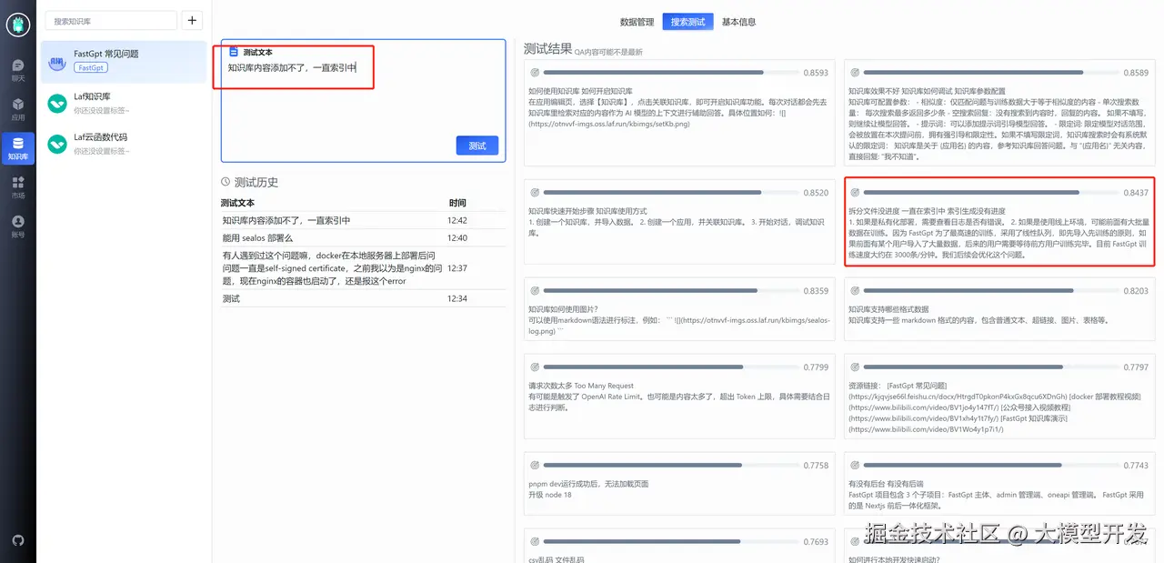 通过搜索测试,我们可以输入问题,查看返回的知识库数据,来测试知识库的查询效果。下面是搜索测试的界面: