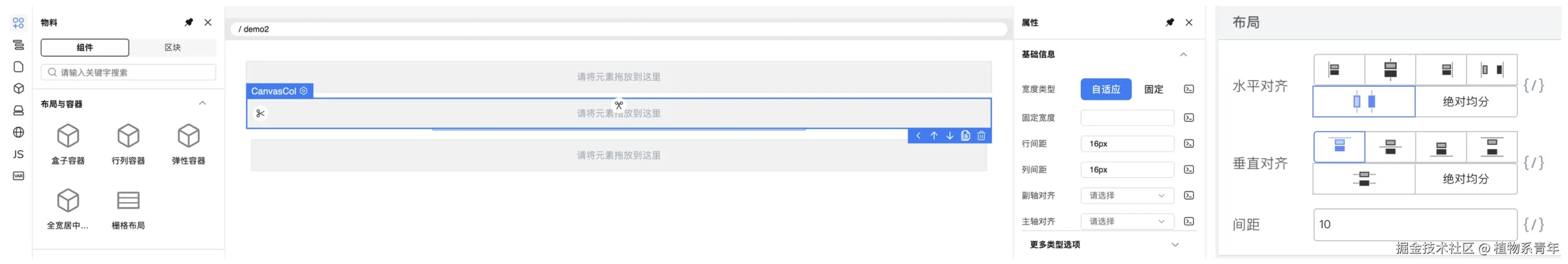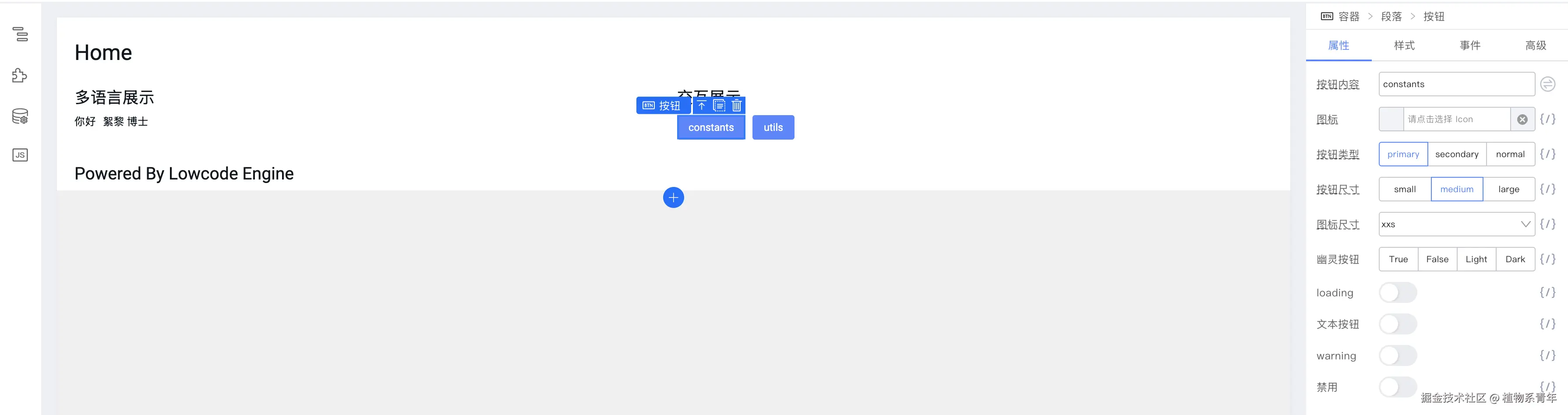 - 平台在右侧(或底部)的属性区动态渲染出该组件可配置的属性、事件、样式等;