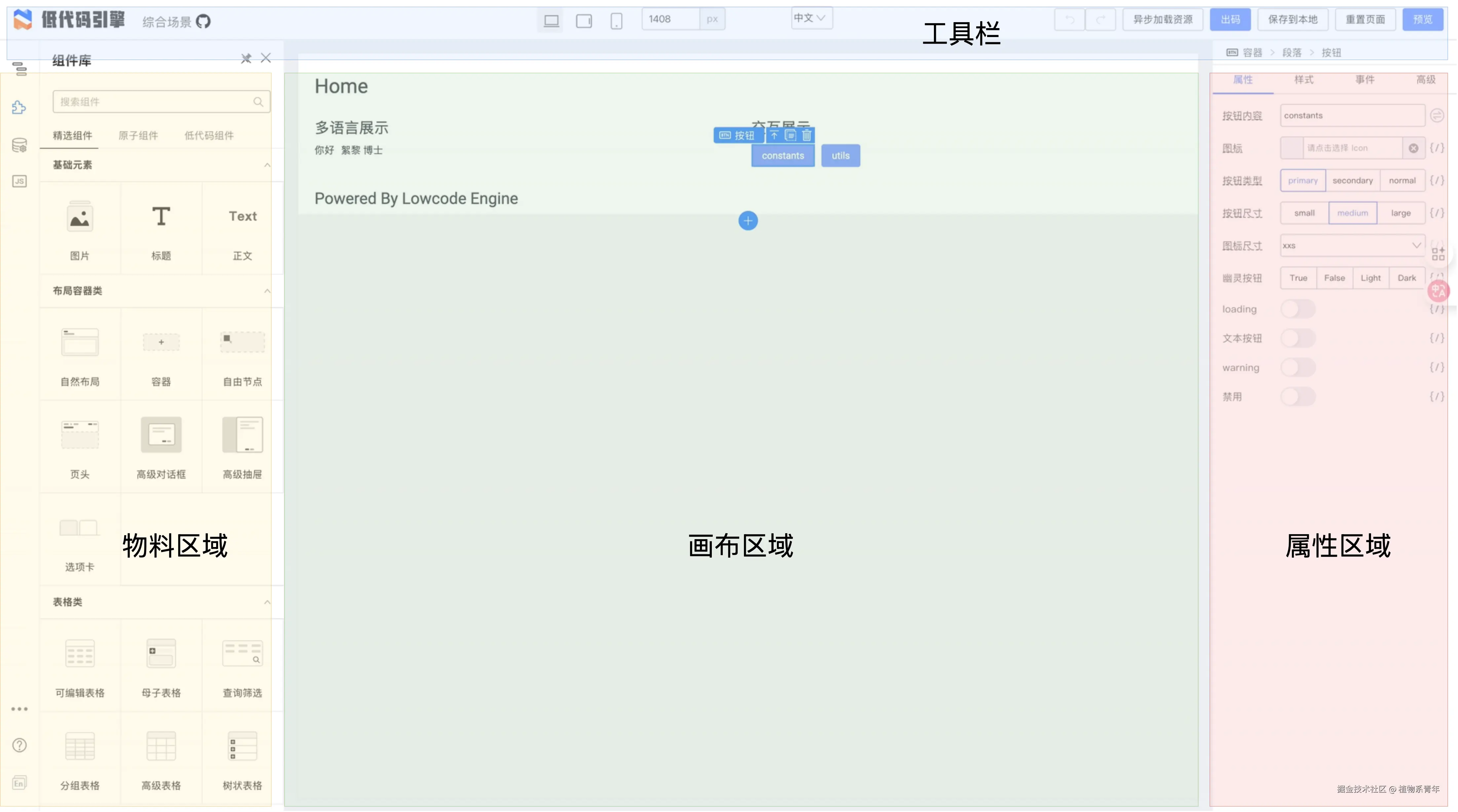 - 物料区域:组件资源集中管理区,用户可以选择合适的组件并拖拽到画布中使用;
