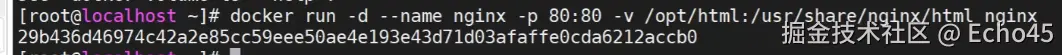 docker run -d -name nginx -p 80:80 -v /opt/html:/usr/share/nginx/htmlng ginx/html nginx