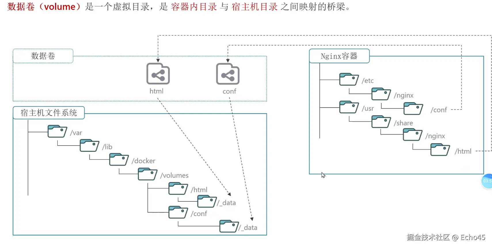 把目录关联起来,我们称为挂载。 我们也允许让容器直接与宿主机目录挂载而不使用数据卷