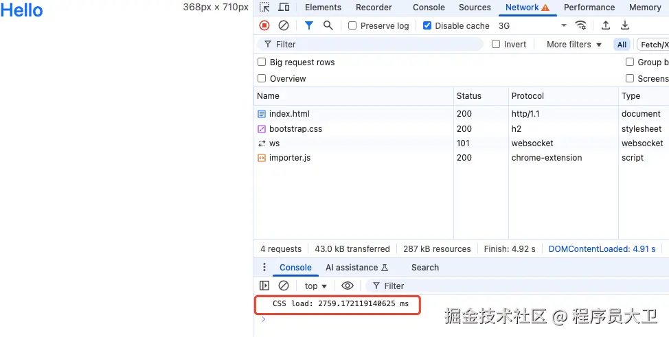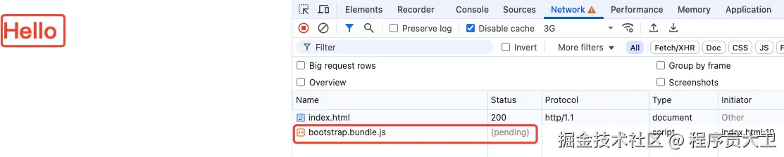 即使 JS 还没加载完,Hello 文字已经渲染到页面上了(黄色字体)。