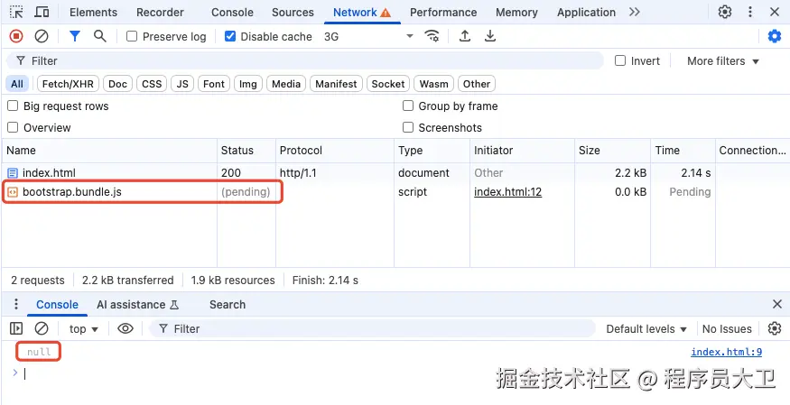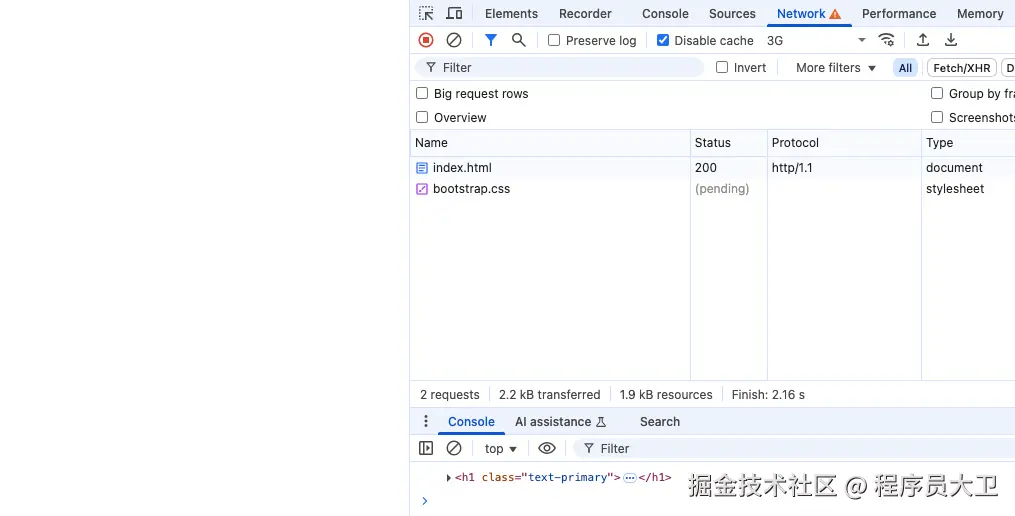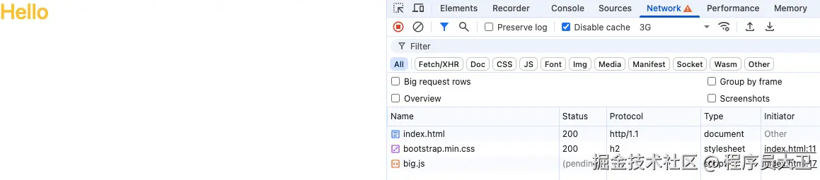 我们准备了一个稍大的 JS 文件和一个稍大的 CSS 文件。 在 Chrome DevTools 的 Network 面板,调整网速为 3G,勾选 Disable cache,以便模拟慢速网络环境,更容易观察资源的加载顺序与阻塞行为。