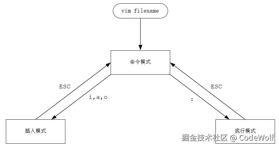 - 2). vim在进行文本编辑时共分为三种模式,分别是 命令模式(Command mode),插入模式(Insert mode)和底行模式(Last line mode)。这三种模式之间可以相互切换。我们在使用vim时一定要注意我们当前所处的是哪种模式。