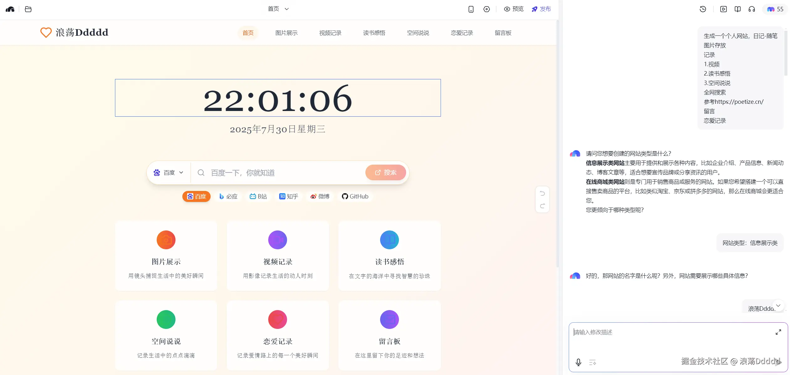 我用秒哒生成了一个个人网站,如果生成的样式和自己的想法有所不同,可以继续修改prompt来改进自己的项目。