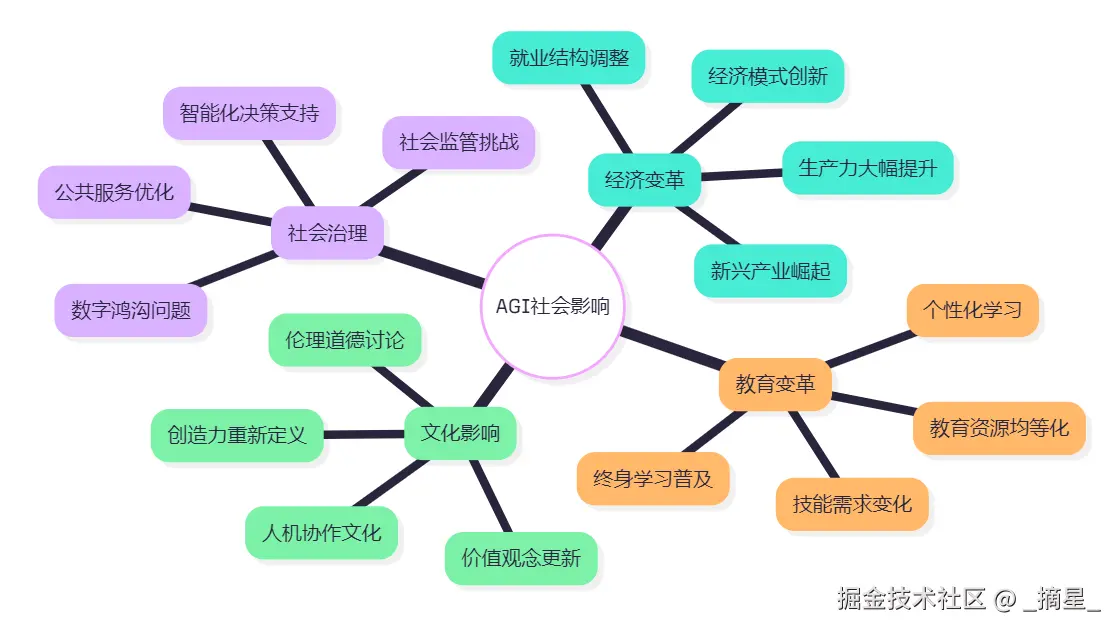 AGI的普及将对社会各个层面产生深远影响,需要提前做好准备和规划。图8 AGI社会影响思维导图