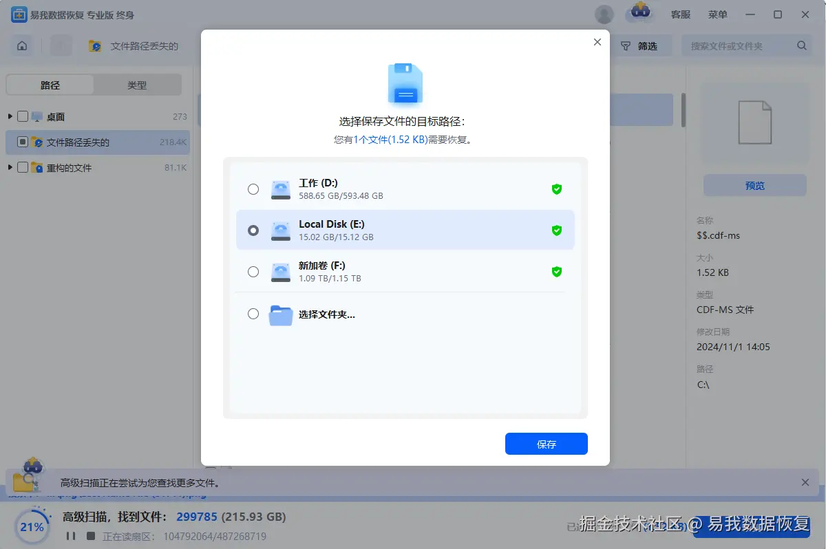步骤3.随后通过软件扫描NAS硬盘,找到文件后确认无误并勾选点击“保存”。切记不要将找到的文件保存到源盘(NAS硬盘),避免之前数据再次被覆盖。