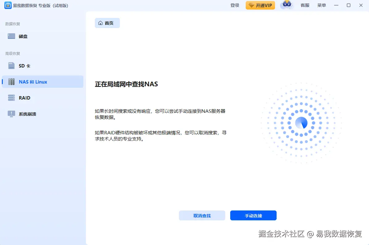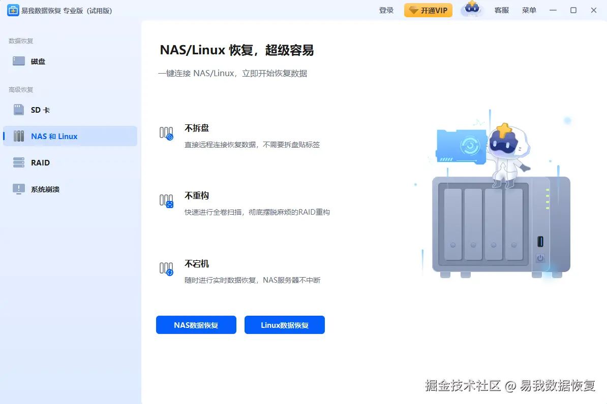 步骤1.点击运行易我数据恢复软件(EaseUS Data Recovery Wizard),点击左侧“高级恢复”下的“NAS和Linux”,选择“[NAS数据恢复]”。