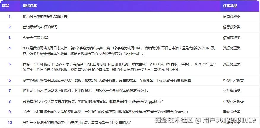 展示本次测评使用的核心测试任务样例,涵盖信息获取、数据处理、可视化分析、系统分析、交互操作等多个维度, 确保测评的全面性和代表性。这些任务的设计充分考虑了实际应用场景的需求,能够有效检验模型在真实工作环境中的表现能力, 为用户提供贴近实际使用情况的性能参考。