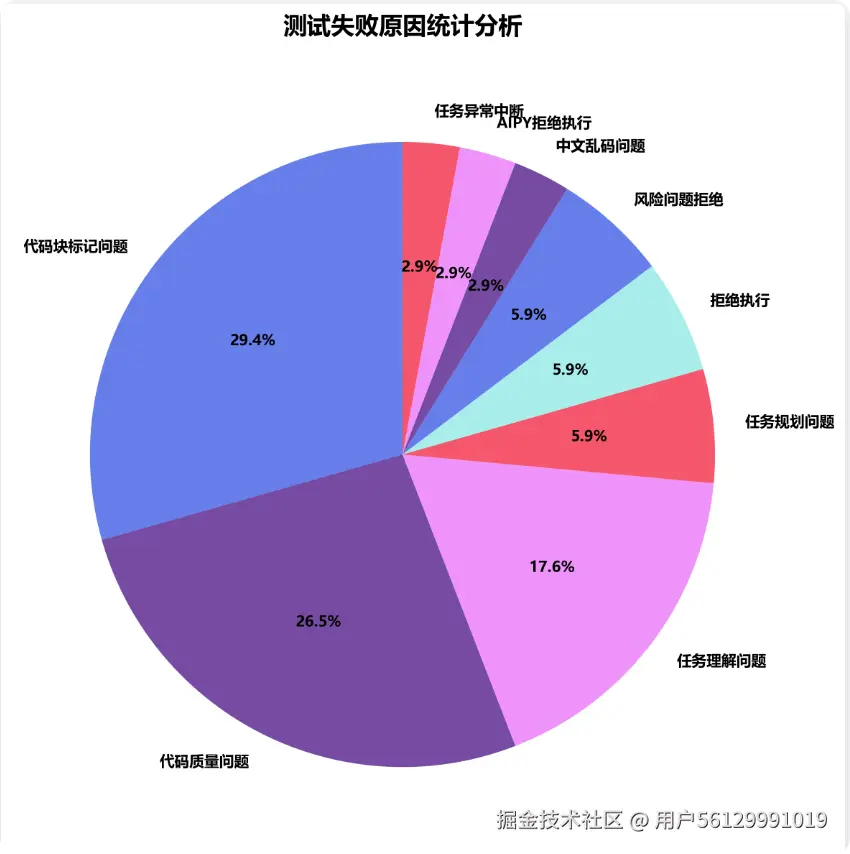 通过深入分析34次失败案例,识别出模型的主要问题点,为模型优化提供方向。 代码块标记问题是最主要的失败原因,占比达到29.4%。这些失败案例的分析不仅帮助我们理解当前大模型的技术瓶颈, 也为模型开发商提供了明确的改进方向,同时提醒用户在实际应用中需要关注的潜在风险点。