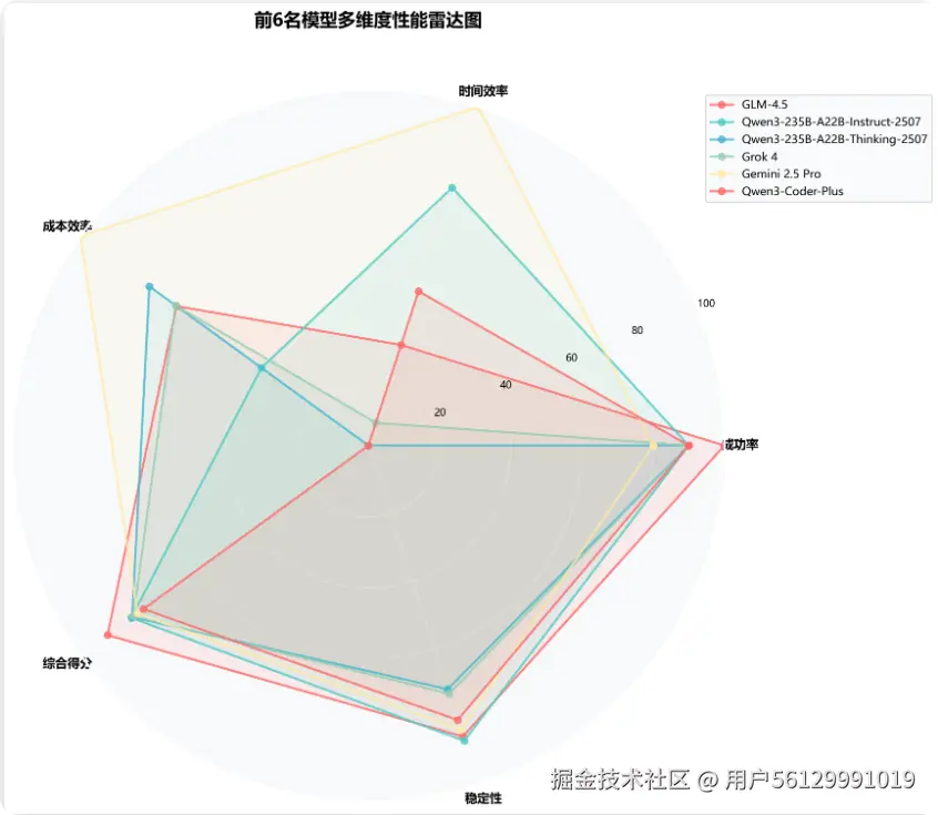 通过雷达图直观展示前6名模型在成功率、时间效率、成本效率、综合得分、稳定性等5个维度的综合表现, 帮助用户根据具体需求选择最适合的模型。每个模型都展现出独特的性能特征,用户可根据自身对不同维度的重视程度, 选择最匹配自身需求的AI助手,实现效果与成本的最佳平衡。
