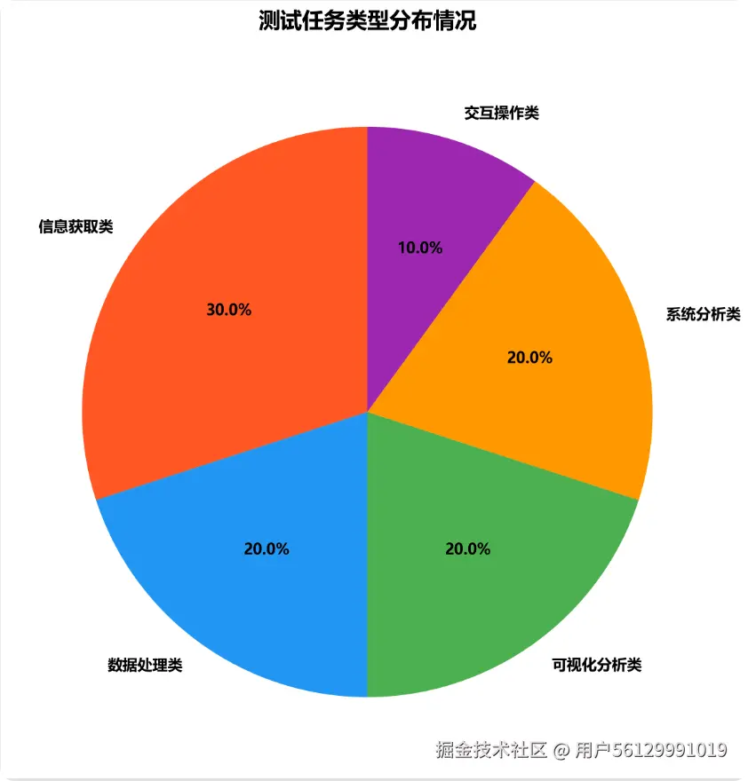 本次测评涵盖5大核心应用场景,全面考察模型的综合能力。 信息获取类任务占比最高,反映了用户对AI获取和处理信息能力的重视。各任务类型的均衡分布确保了测评的全面性和代表性, 能够真实反映模型在不同应用场景下的实际表现,为用户根据具体需求选择合适模型提供了科学依据。