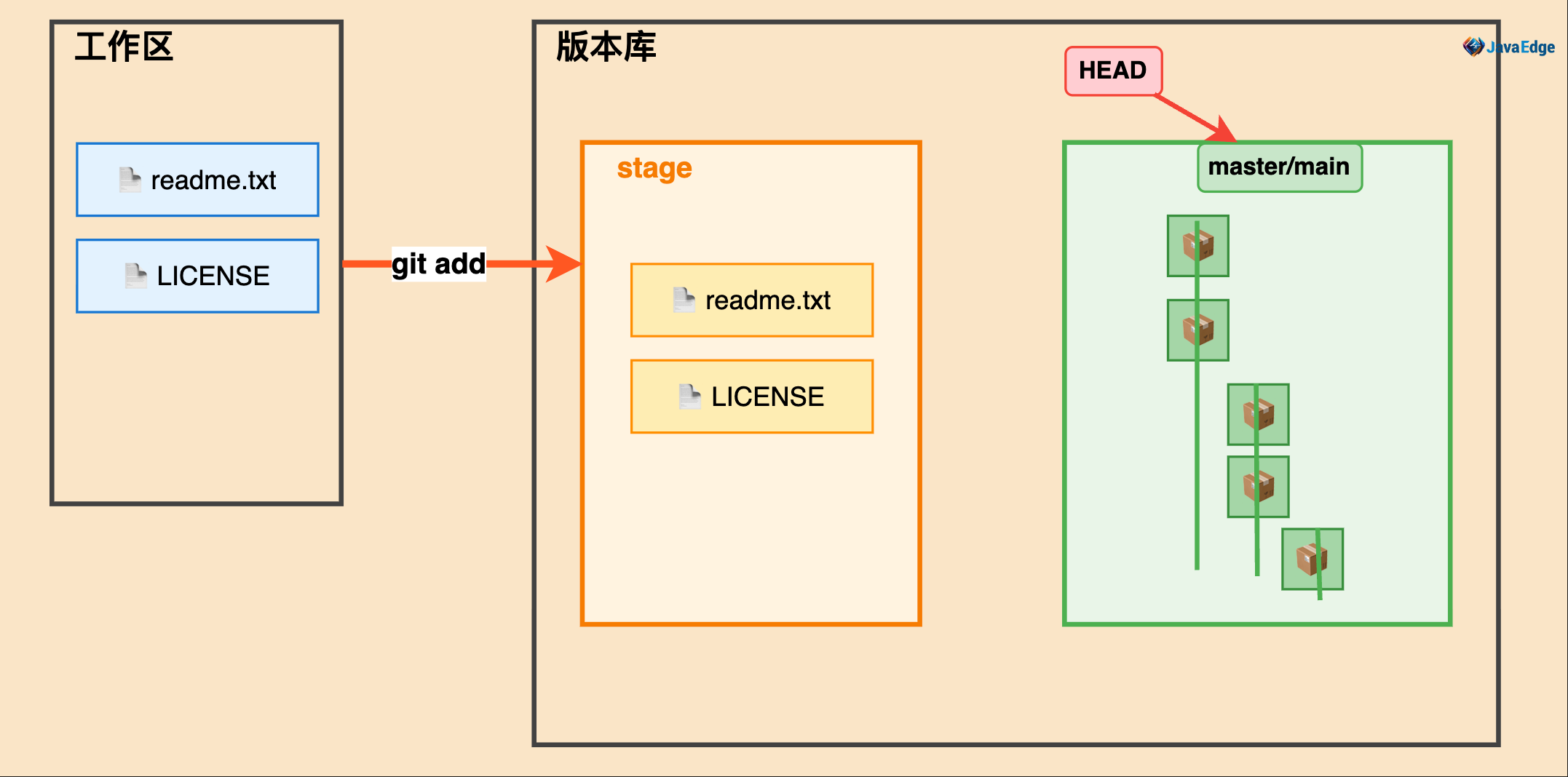 - stage(或称index)暂存区。git add就是把文件从工作区添加到暂存区