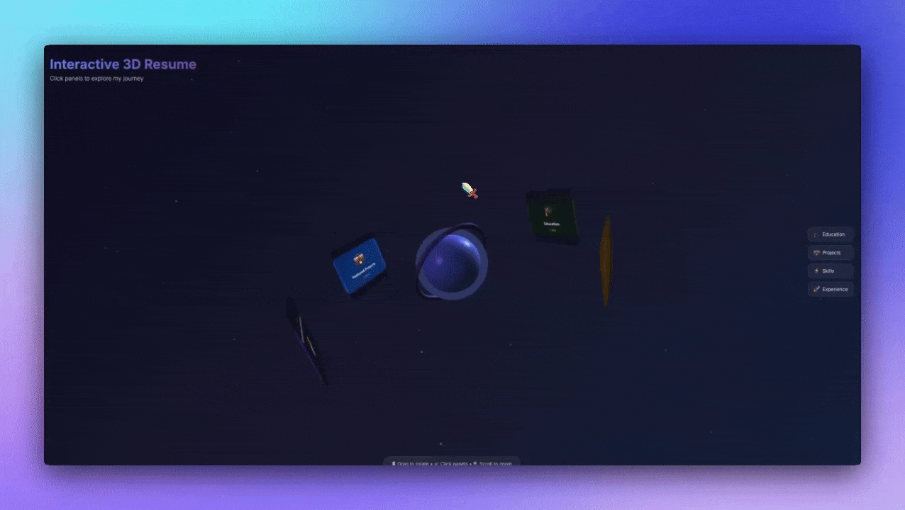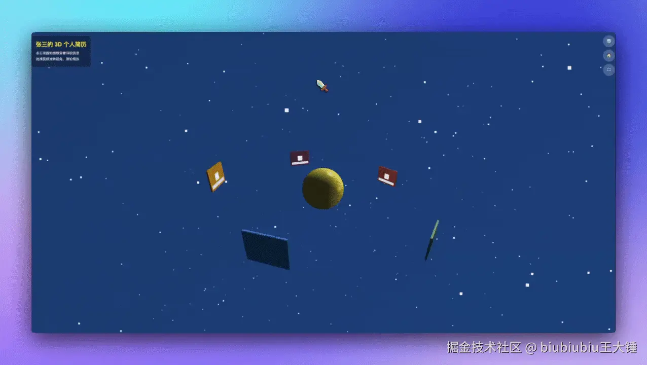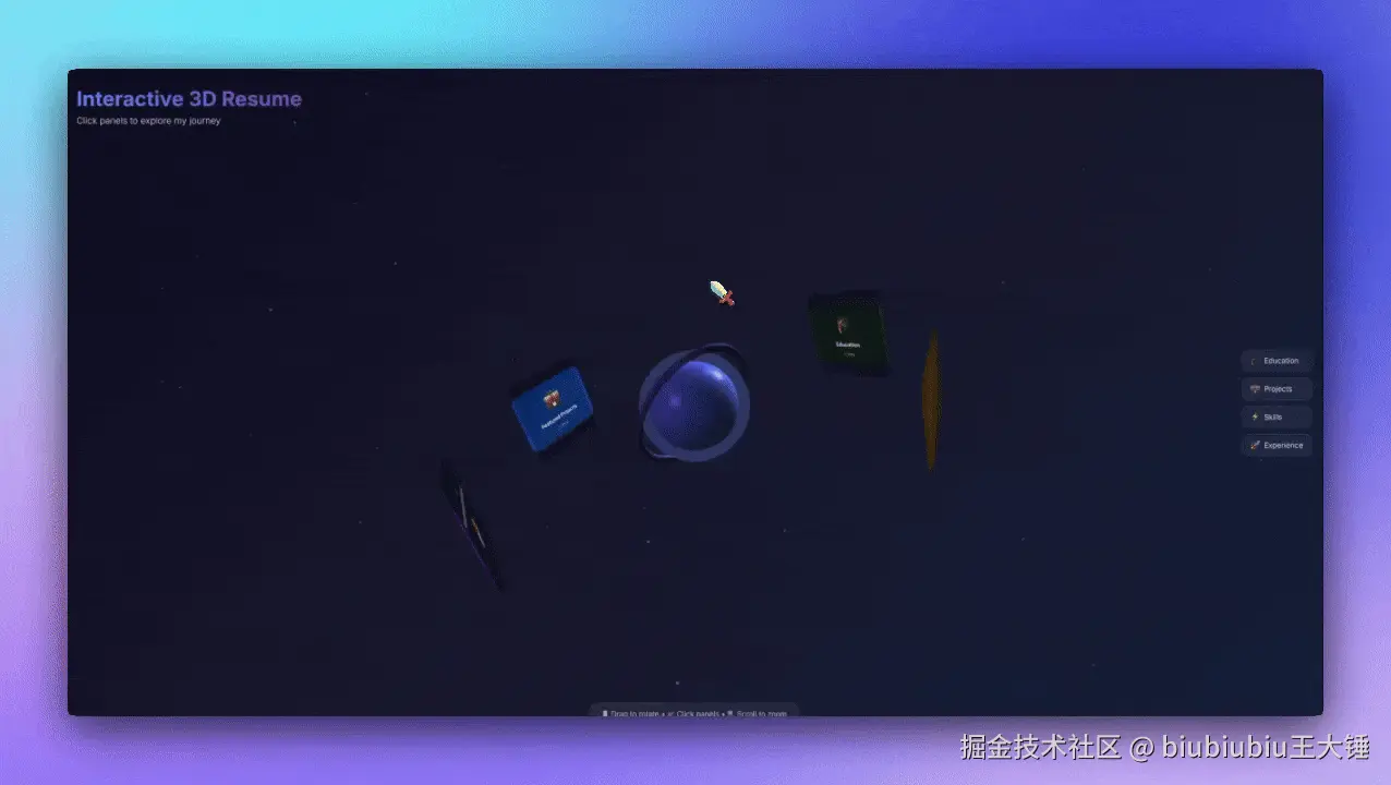 - 设计一个使用 Three.js 构建的 3D 个人简历页面。将简历内容(教育、项目、技能等)展示为在空间中漂浮的面板,围绕一个核心头像旋转。用户点击某部分内容,会将该内容动画放大居中,并展示详细信息。