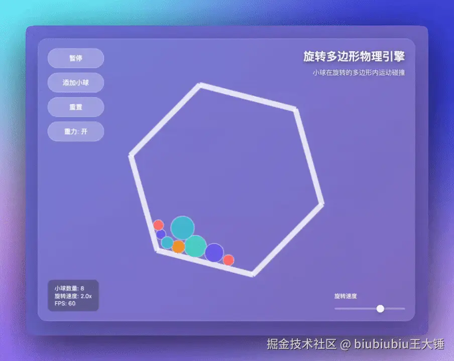 - 使用物理引擎设计一个场景,使得一个旋转的多边形内多个小球运动并发生碰撞,动效逼真且不穿透多边形边界