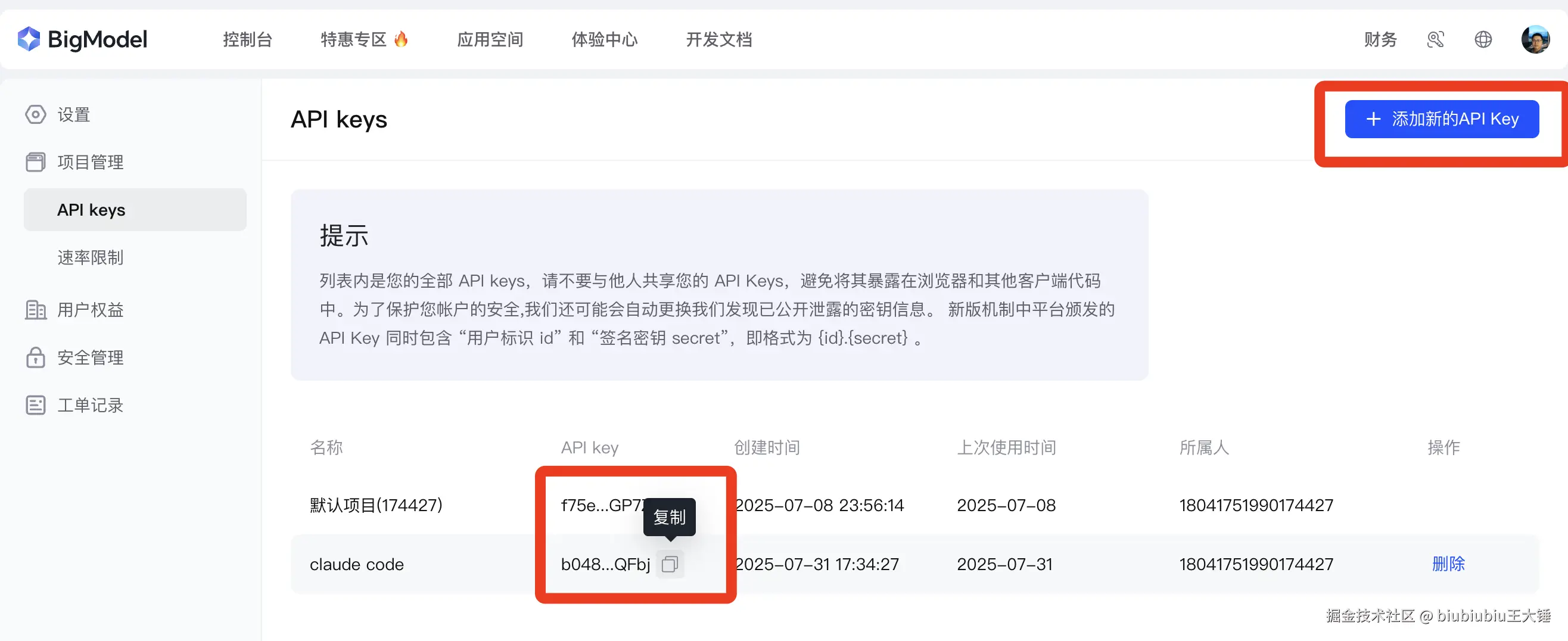 获取API Key: 登录成功后,前往API Key管理页面。注意: 默认的API Key可能仅支持体验使用,为了正常调用GLM-4.5模型,你需要添加一个新的API Key。