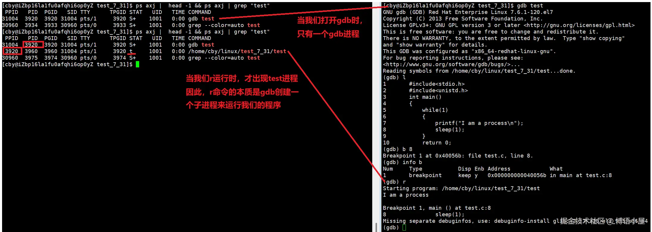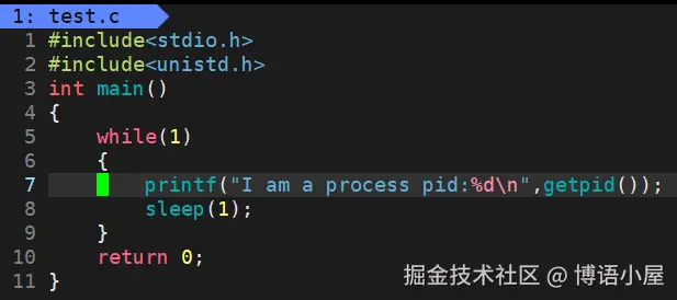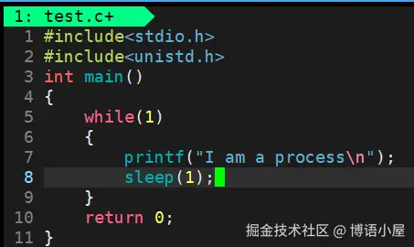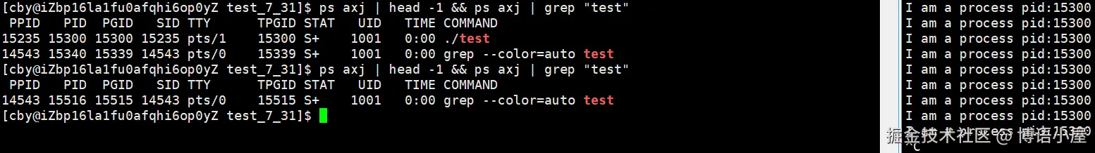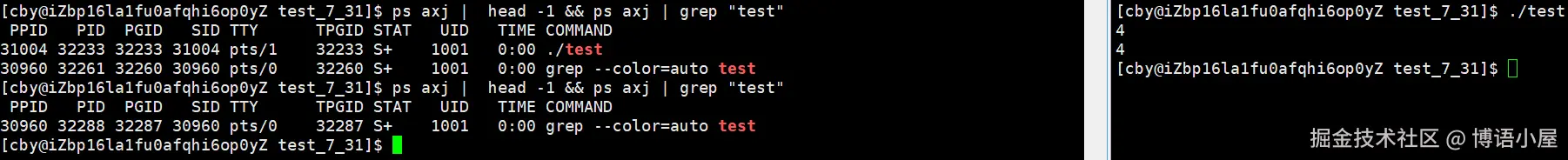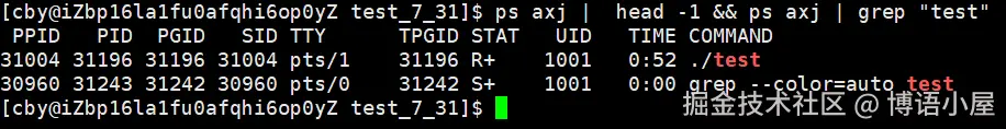 我们可以看到,在test进程运行时,它的状态为S+,当停止运行时,就看不见了