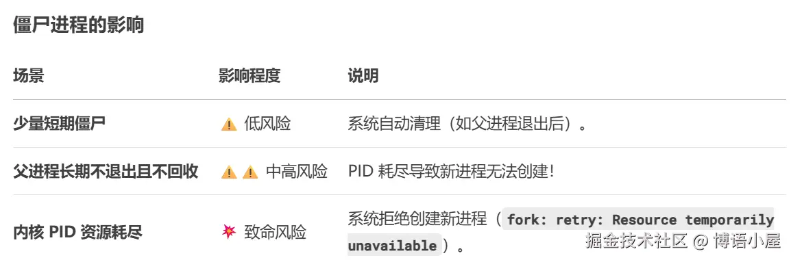 僵尸进程: 已经终止的子进程,但其父进程尚未调用 wait() 系列函数来读取其退出状态并回收资源。僵尸进程不再运行,不消耗 CPU 和内存(除了其进程表项占用的少量内存),但会占用一个进程 ID。僵尸进程是父进程没有尽到回收责任的结果。