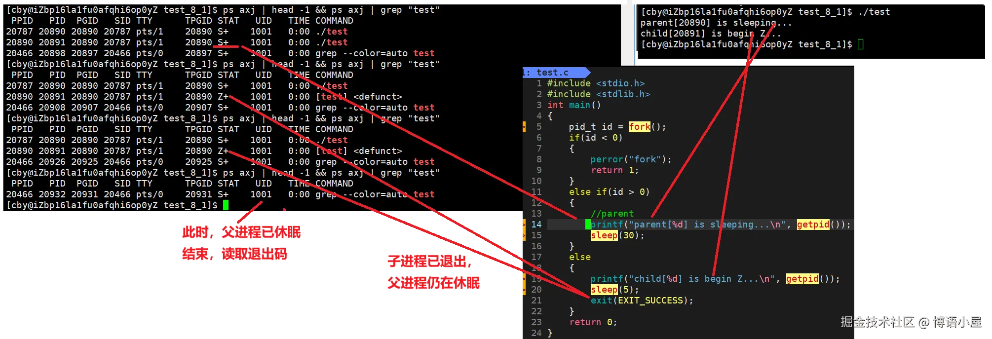 📌 关键点:僵尸进程会持续存在直到其父进程调用 wait() 系列函数或父进程退出(此时僵尸被 init 进程回收)。