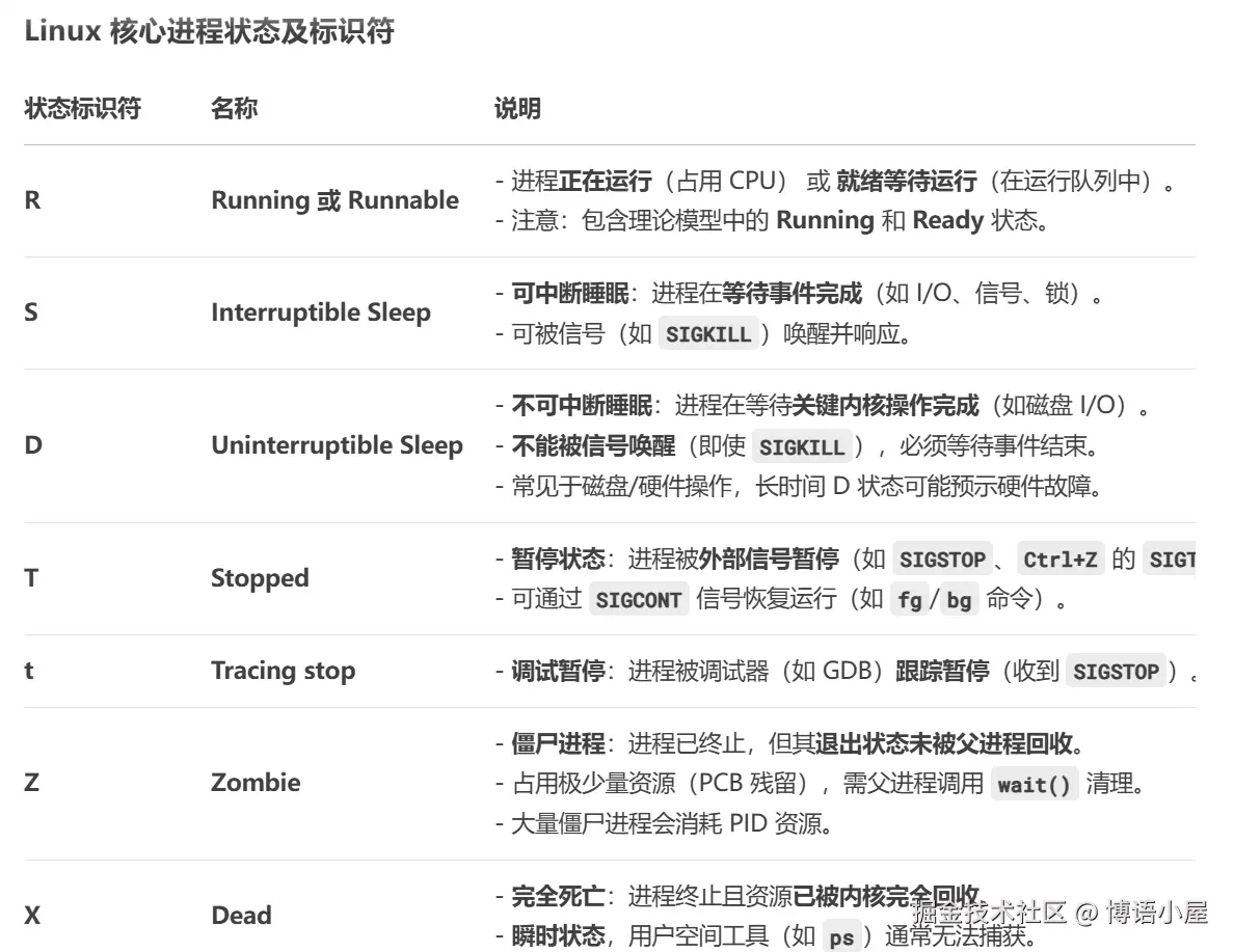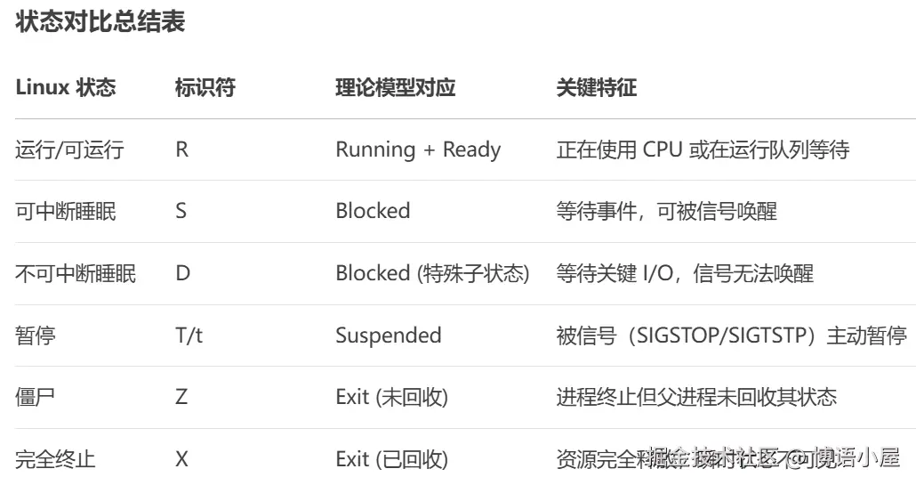 在 Linux 中,进程状态通过内核定义,比经典理论模型更细粒度