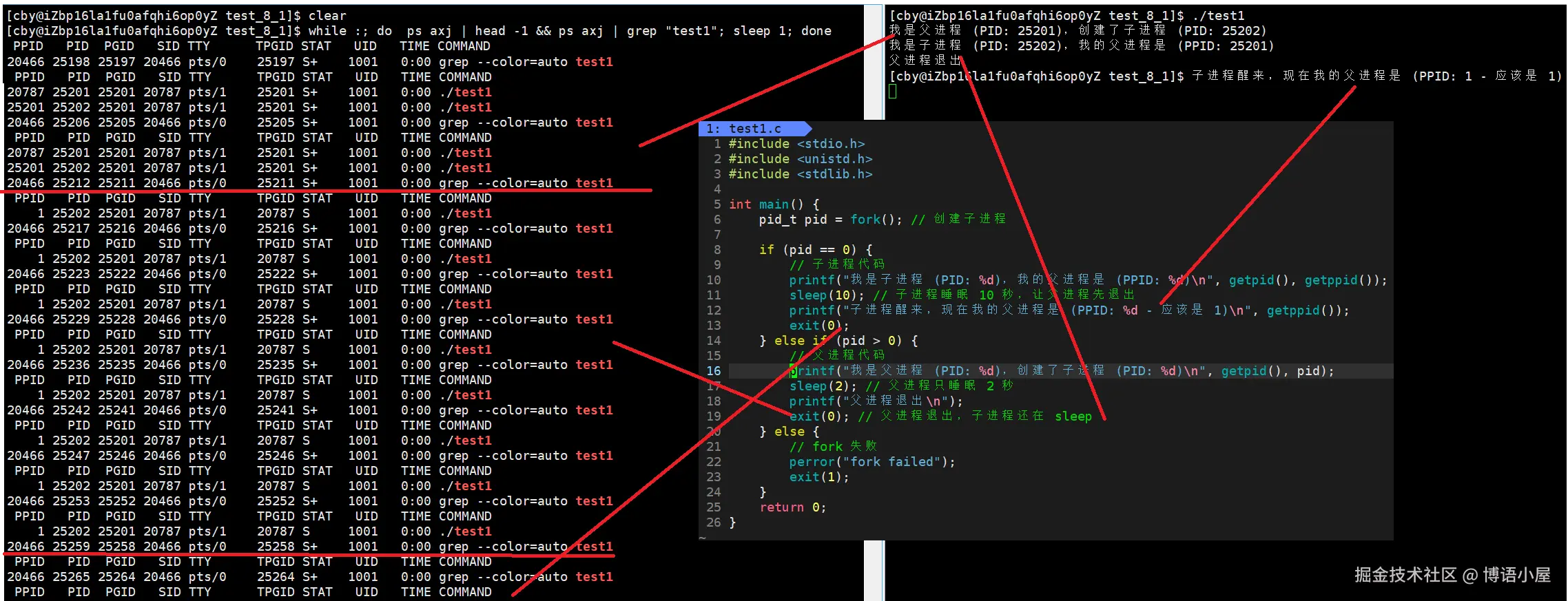 - 子进程在睡眠 10 秒后醒来,打印信息时会显示其父进程 ID 为 1。