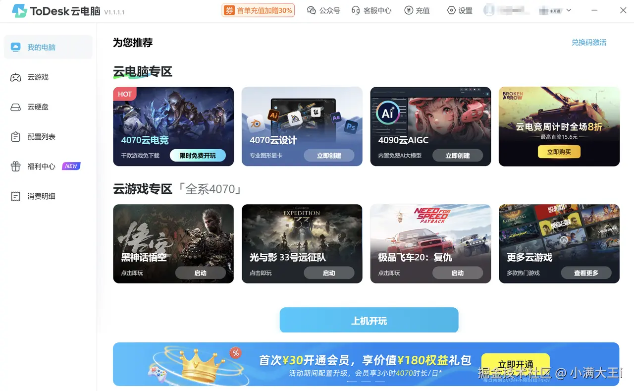 ToDesk云电脑:i7 - 12700KF 12 核 20 线程打底,多任务稳如 “性能底座”,搭配 RTX 4070 显卡,硬件协同被平台拉满。跑分第一靠 CPU 多核火力全开,游戏、创作多场景通吃,优化让硬件潜力榨到极致。