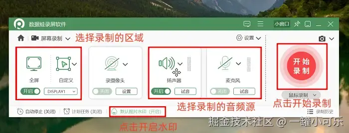 步骤2:在屏幕录制页面,选择合适的录制区域,接着调整好录制声音。如果你想给视频加上水印,可以点击 “图片水印” 进行设置。弄完之后,点击 “开始录制” 按钮,就可以开始录屏啦。