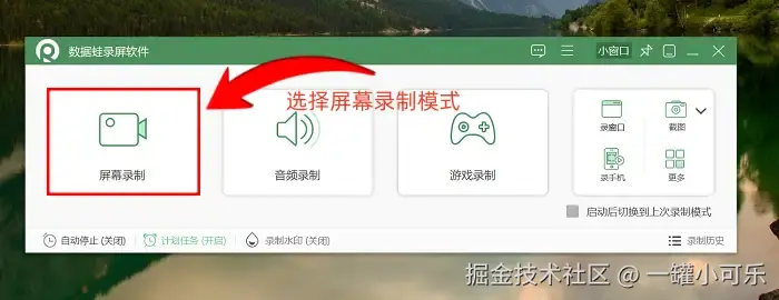 步骤1:打开软件,在主界面就能看到各种录制模式,根据自己的需求选择就行,比如常规电脑录屏就选择 “屏幕录制” 模式。