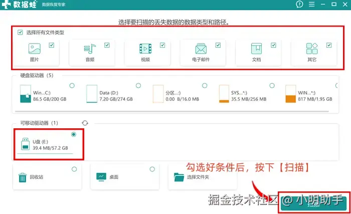 第1步: 在电脑中双击打开软件后, 我们进入到扫描准备页面,勾选出自己的目标数据类型后,再勾选需要扫描的U盘,最后才按下【扫描】。