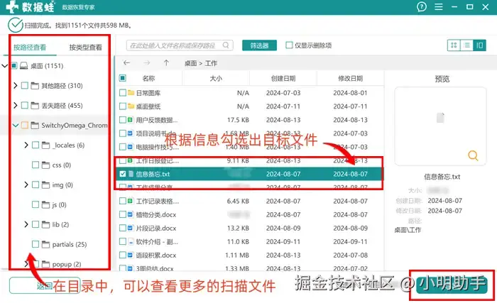 第2步: 在扫描文件的列表中选出自己丢失的U盘文件,点击文件我们可以查看文件更多的信息。还需要找更多文件的朋友,可以在目录中选择其他的路径或分类,进行文件勾选,点击【导出】。
