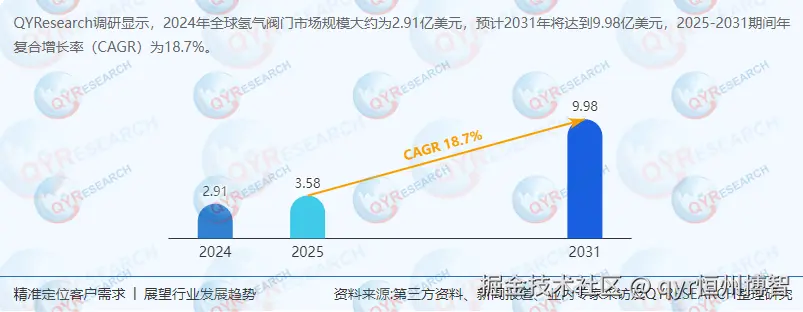 根据QYResearch最新调研报告显示,2024年全球氢气阀门市场规模达2.91亿美元,预计2031年将增至9.98亿美元,2025-2031年CAGR为18.7%,显著高于传统工业阀门增速(约5%)。这一增长受全球氢能战略升级与终端应用场景拓展的双重驱动。