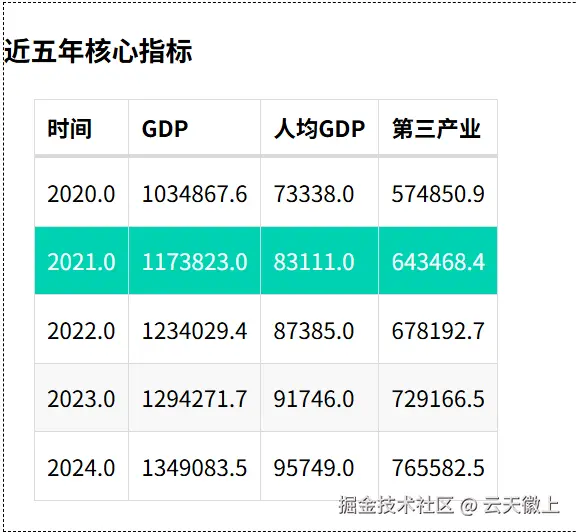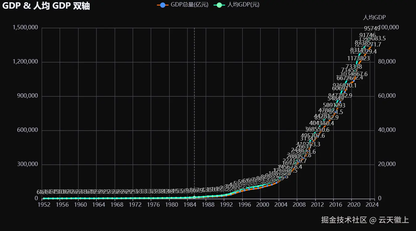 在经济学中,GDP(国内生产总值)是衡量一个国家经济状况的重要指标。本文将使用Python的Pyecharts库对中国历年GDP数据进行可视化分析,包括产业构成、GDP时空热力图、GDP总量与人均GDP双轴渐变折线图、行业雷达图、产业变迁热力图以及交互表格展示。